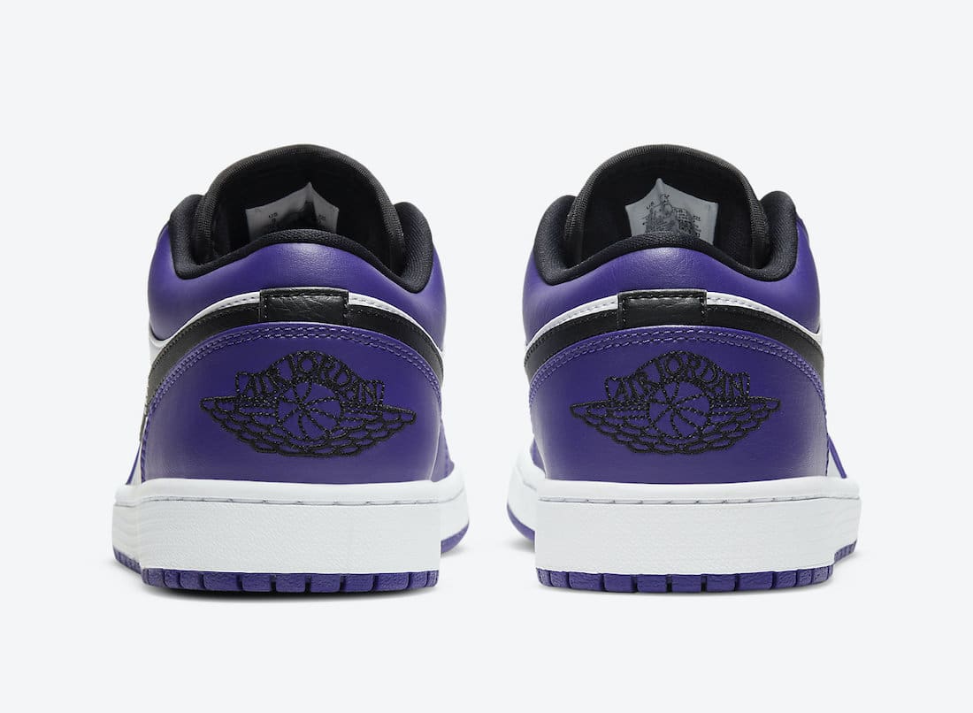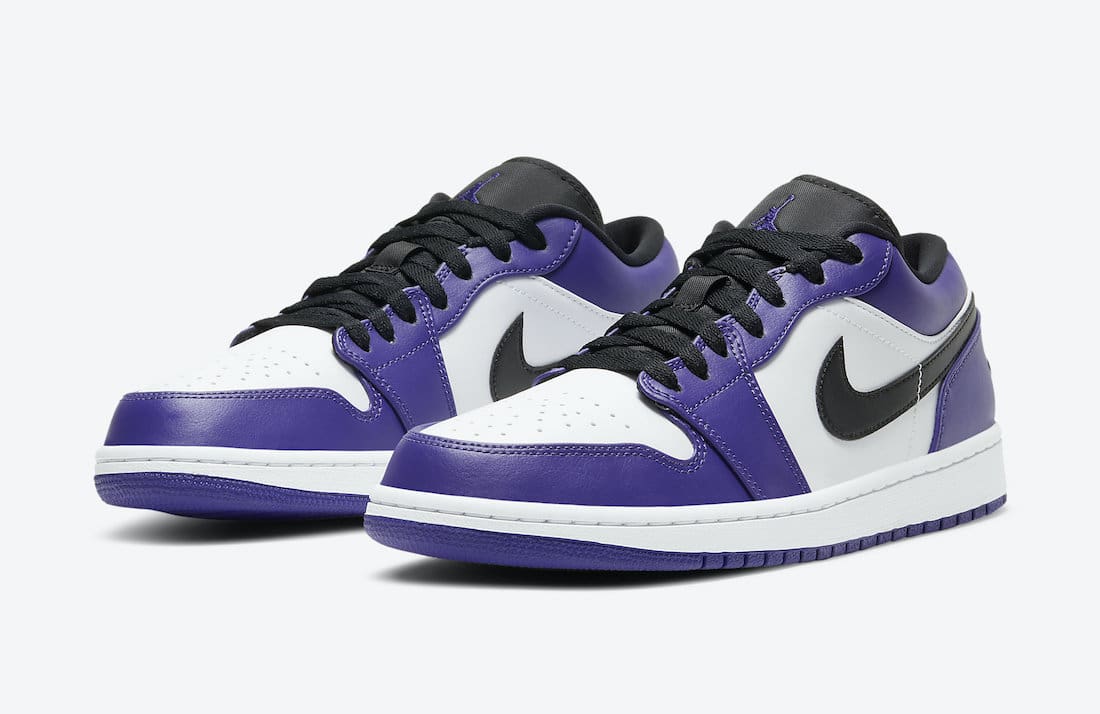 Dressed in the traditional Court Purple, White, and Black color scheme. Thisu00a0Air Jordan 1 Lowu00a0sports a White leather base with Purple overlays and Black detailing on the tongues, laces, and Swooshes. A White midsole atop a Purple rubber outsole completes the design.