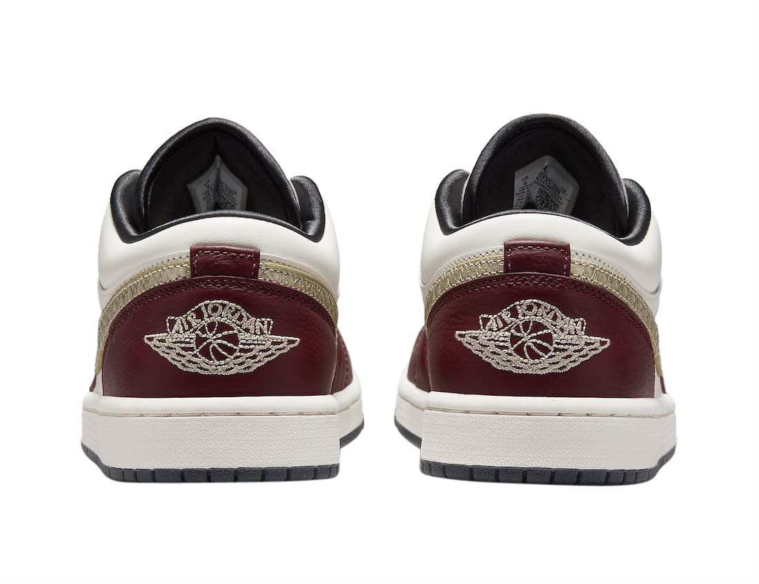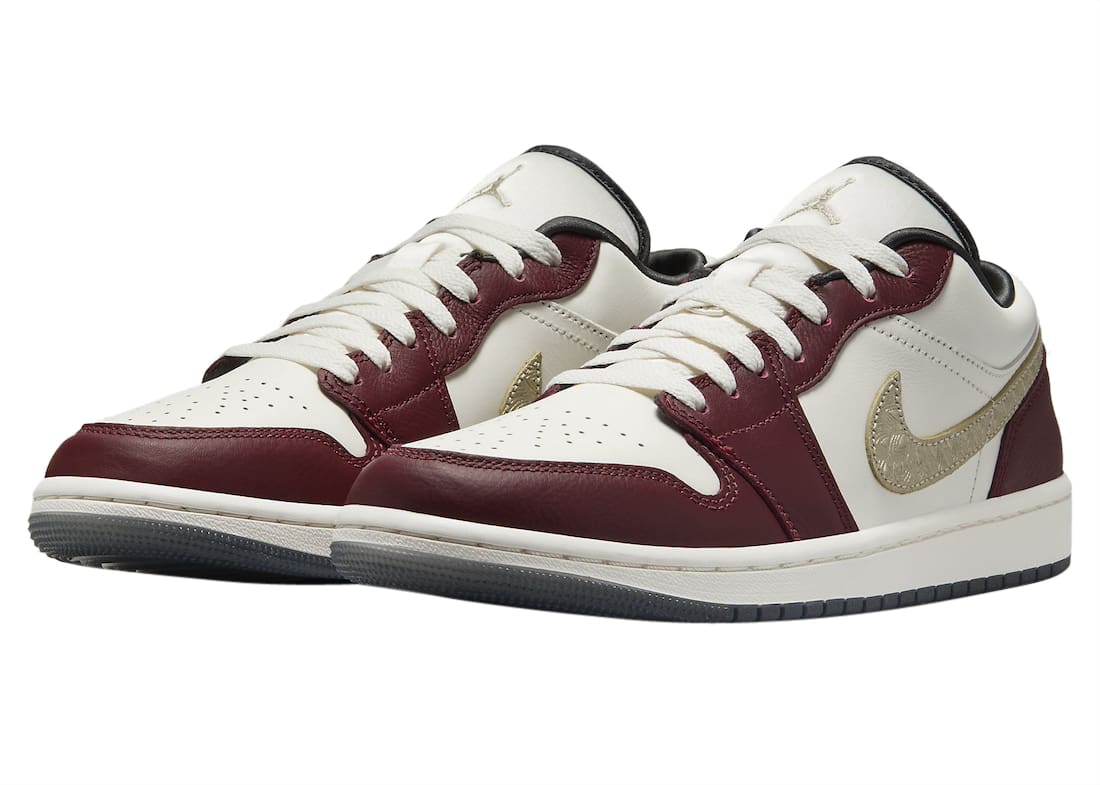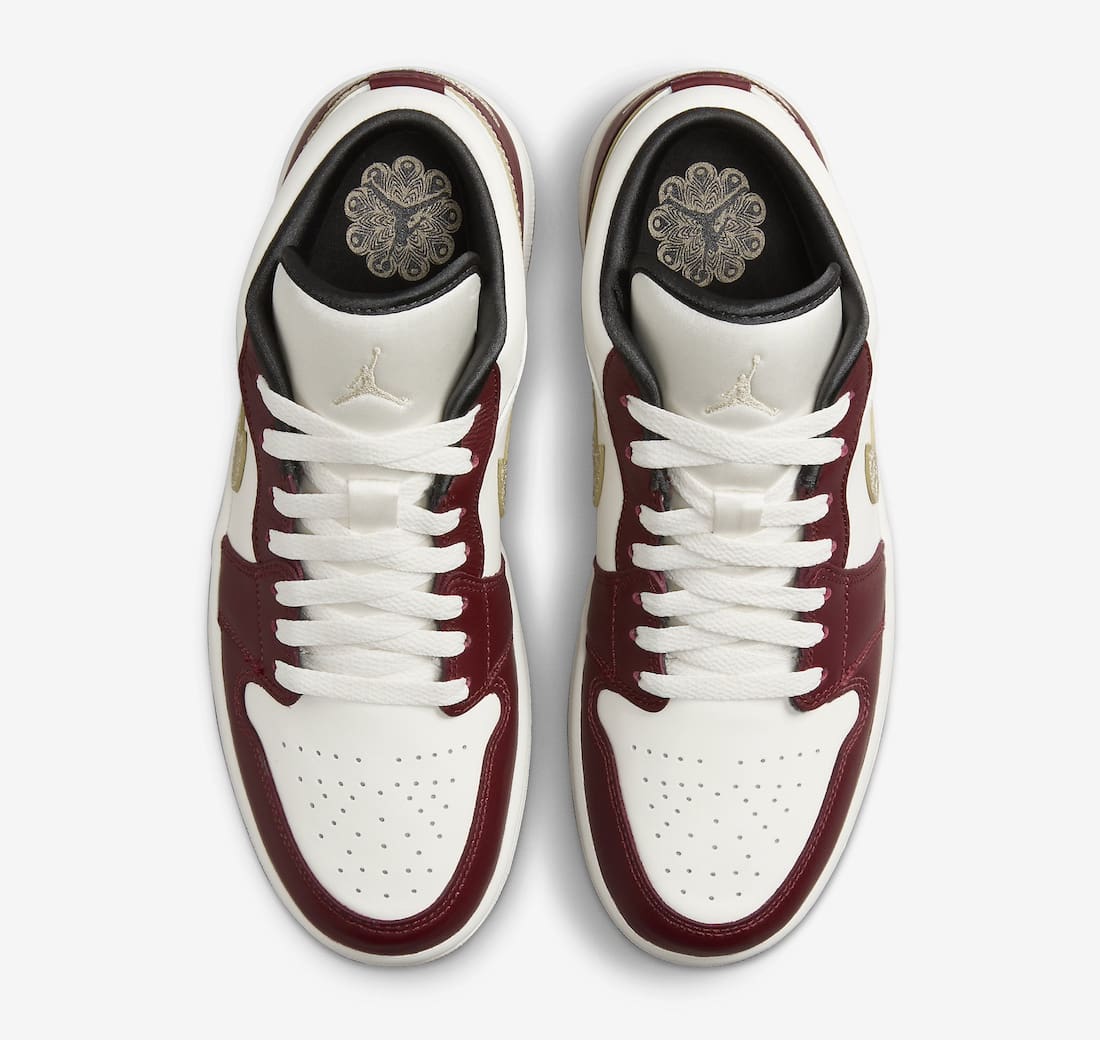 This special holiday-style Air Jordan 1 Low features a Sail leather base contrasted by Dark Team Red overlays and Metallic Gold Swoosh logos. Paying homage to the mythology and cultural significance of the Year of the Dragon, design details include luxurious gold embroidery on the tongue and heel, as well as matching insole graphics. The Swoosh branding on the side panels is also replete with dragon scale graphics, while a special decorative hangtag adds a welcome element to the Chinese New Year theme.