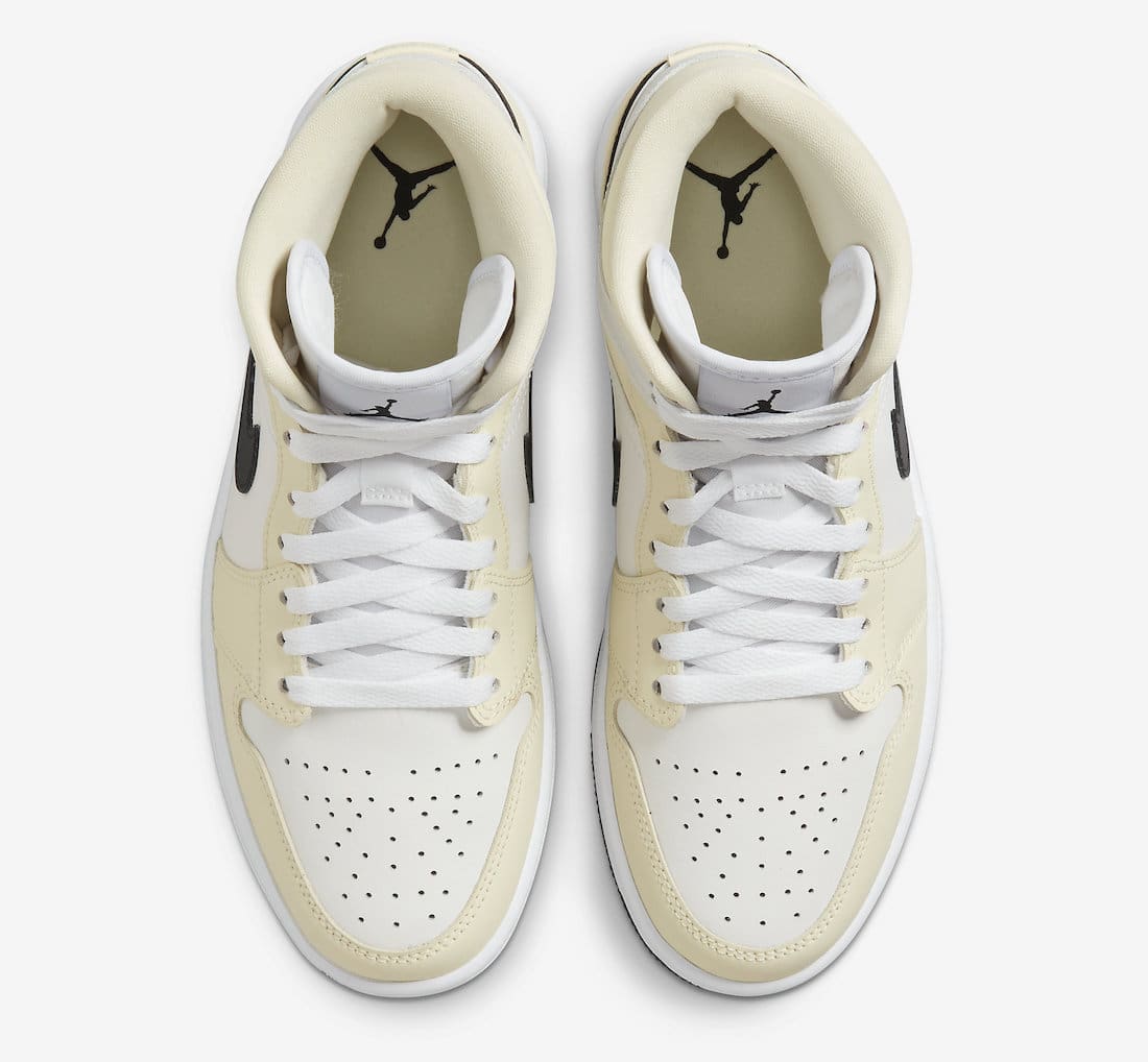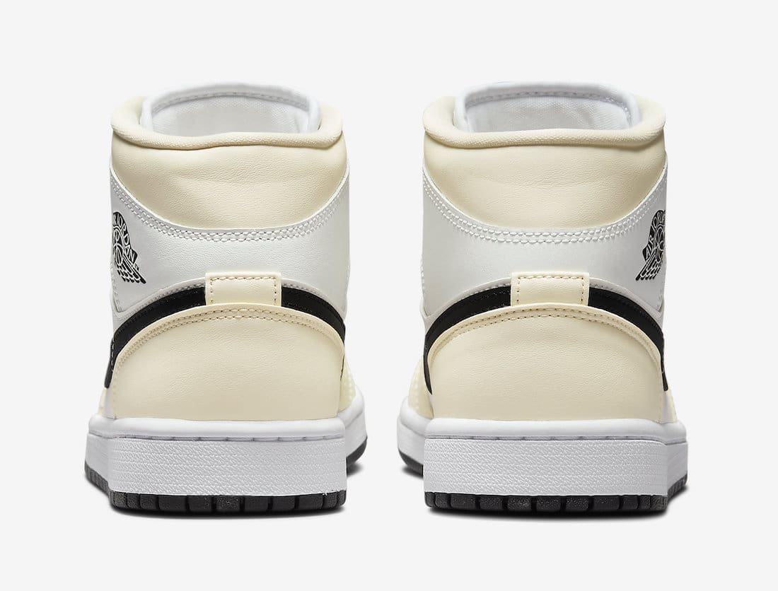 Flaunting a pristine color scheme of u201cCoconut Milk/Black-Summit White-White,u201d the mid-top bears a two-tone leather construction with white for the base and the highlight Coconut Milk hue adorning its overlays and inner lining. Finally, contrasting black for the wings logo and Swooshes, followed by a white midsole and black rubber outsole tops off the design.