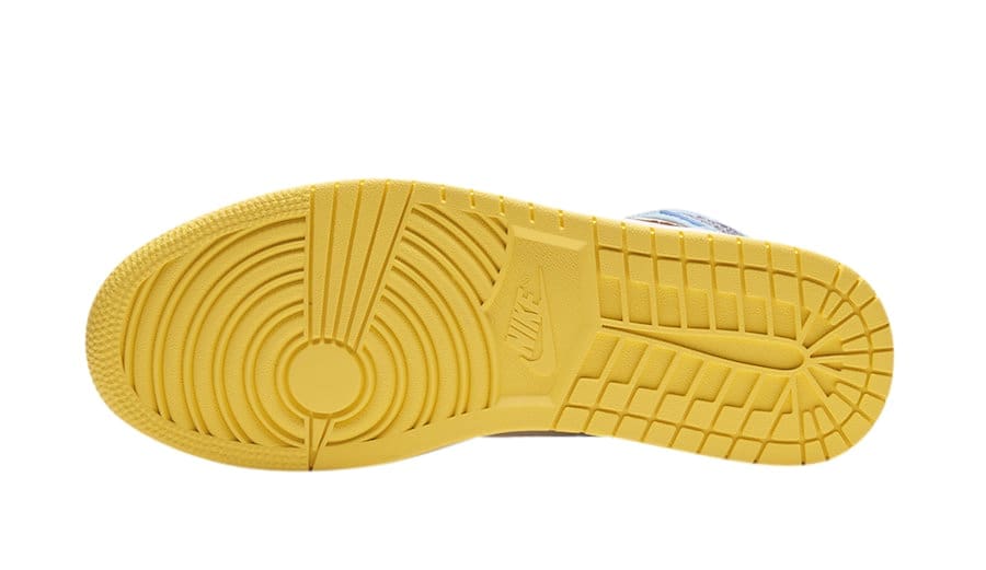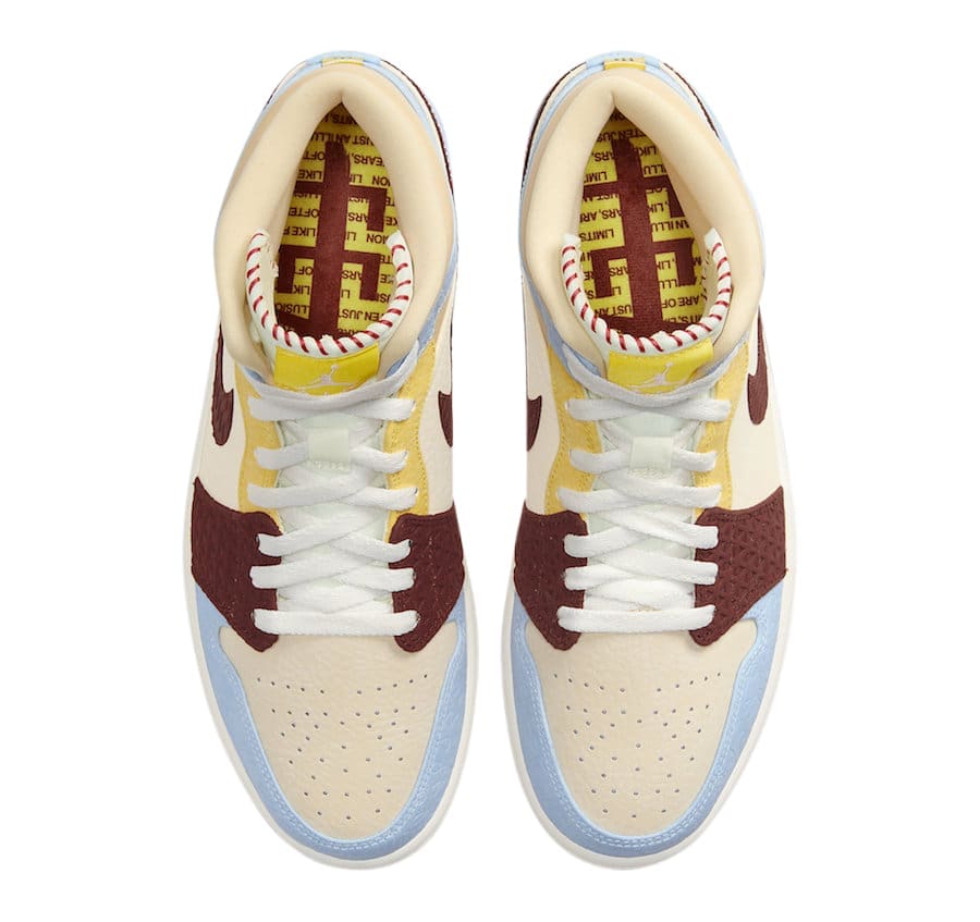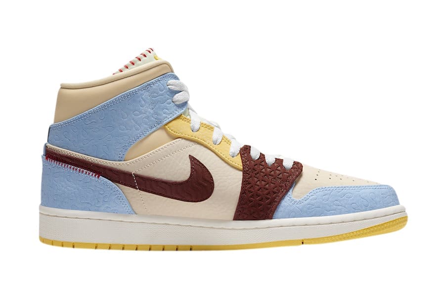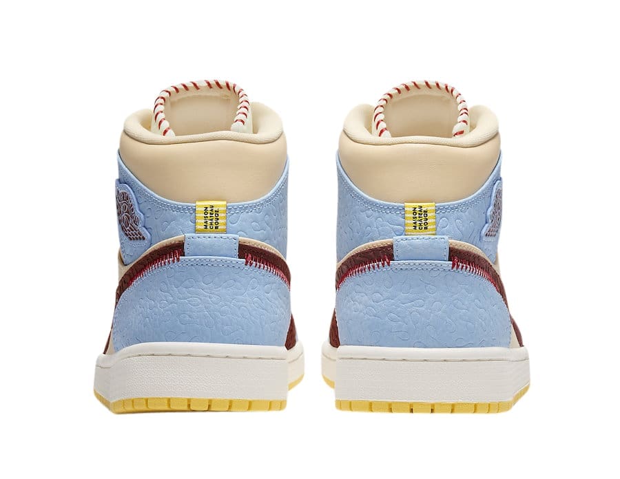 This Jordan 1 Mid SE is made up of a Cream, Brown, Yellow and Light Blue leather upper with Red stitching on the heels and tongues. Maison Chateau Rouge branding on the heel tabs, sail midsoles and yellow outsoles complete the design. These sneakers released in November 2019 and retailed for $130.