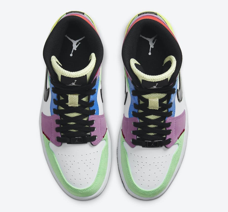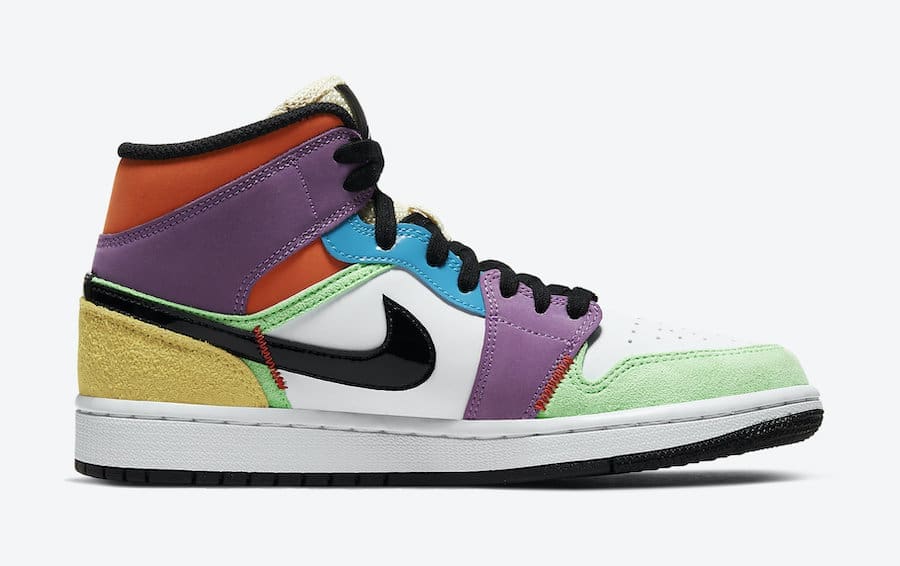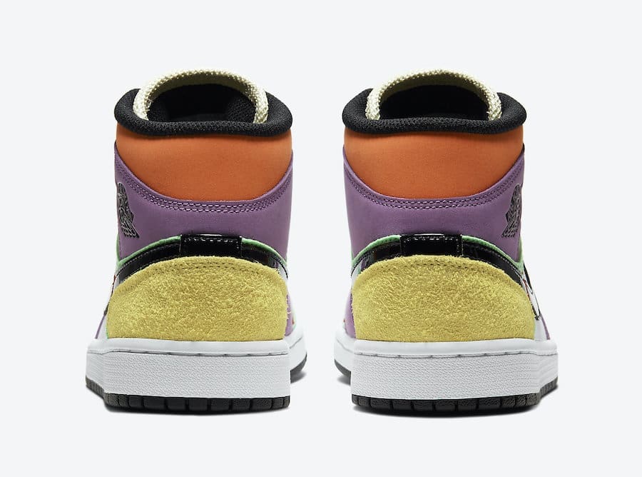 Defined by an array of vibrant colors: neon green, pink, purple, blue, orange, yellow, and black u2014 the tones are applied throughout the upper in a colorblock theme. Additionally, its composition consists of various material such as smooth leather, nubuck, suede, hairy suede, patent leather, and mesh. Furthermore, the semi-deconstructed model flaunts exposed stitching and a u201cLightbulbu201d woven mesh tongue. Finally, Jumpman branding on the tongue and Wings branding on the collar top off its design.