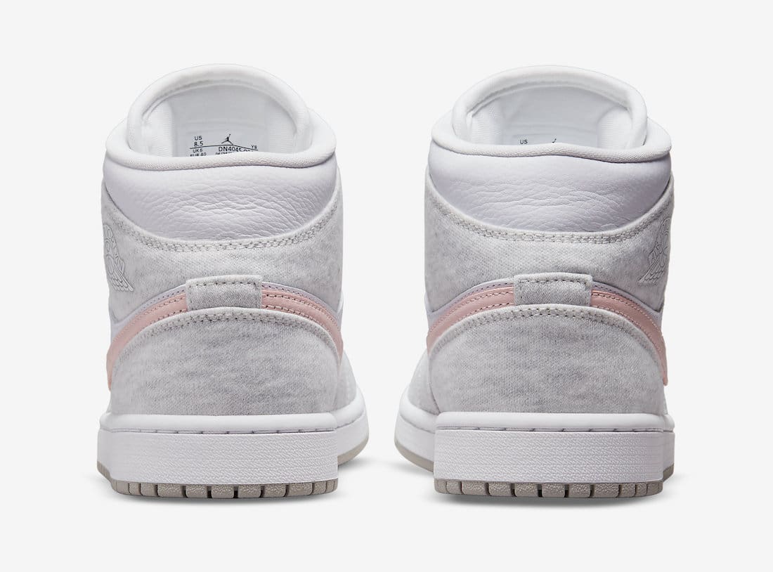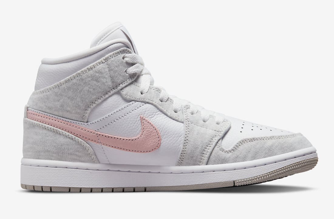 The pristine makeup consists of features a white leather base that is complemented with a subtly-patterned canvas-like material for its overlays. Pops of pink for the leather Swooshes, followed by the wings logo on its ankle portion, a white midsole and Iron Ore rubber outsole rounds out the look.