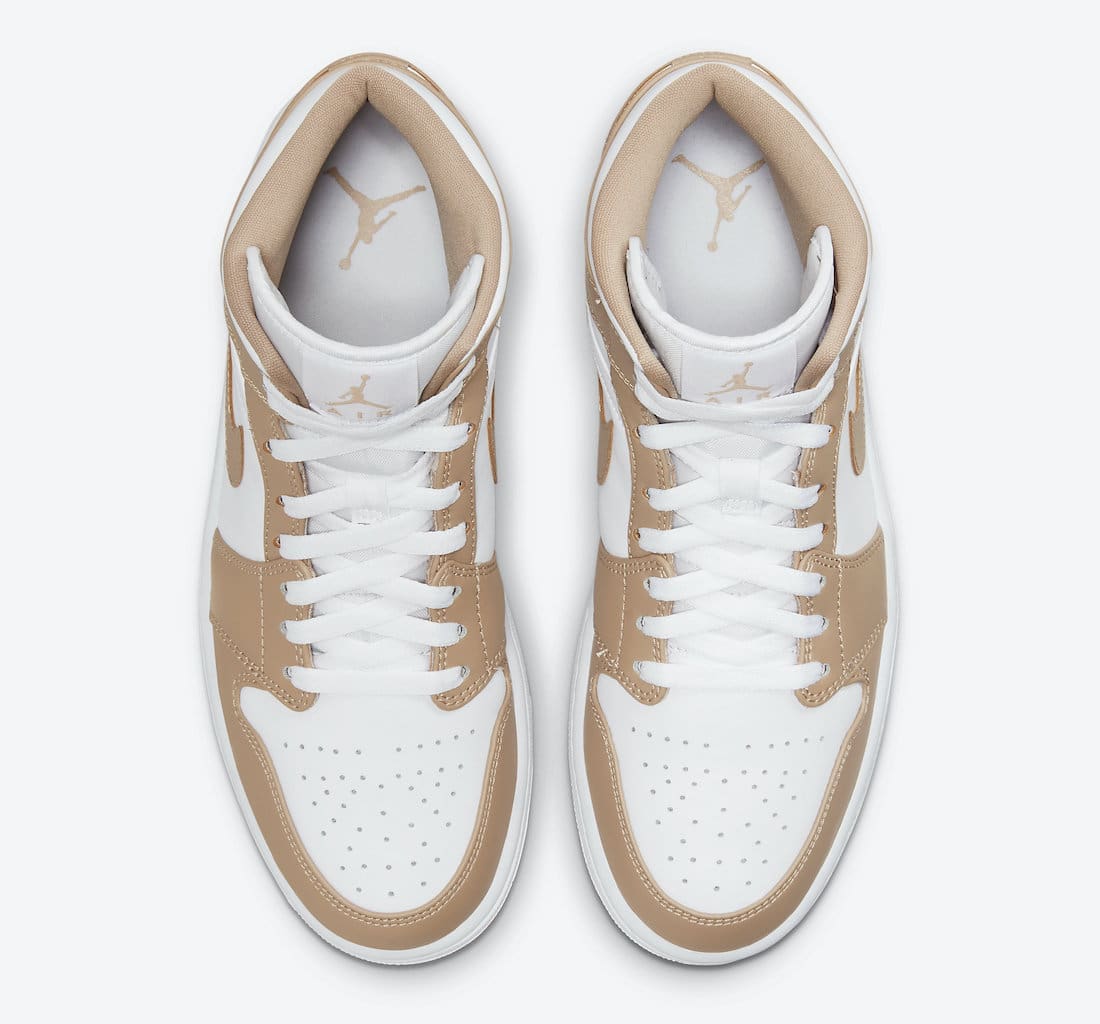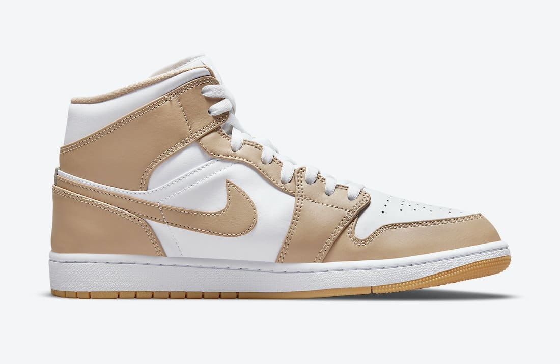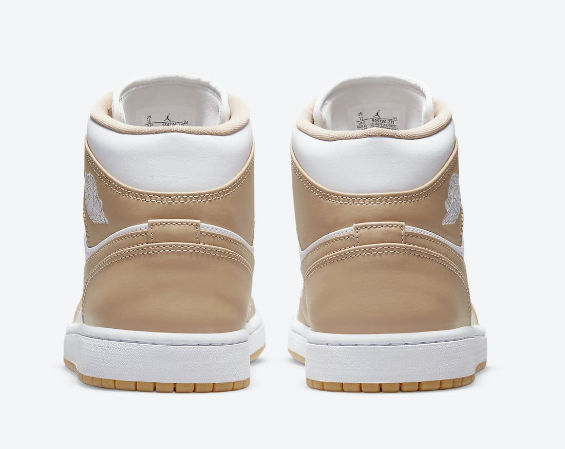 The ��Tan Gum�� iteration of the mid-top Air Jordan 1 showcases a clean and sophisticated design. The shoe features a crisp White leather upper, complemented by Tan overlays that add a touch of warmth. This sleek two-tone theme is carried throughout, with White underlays providing a sharp contrast to the Tan accents. The look is completed with a White midsole and a classic Gum rubber outsole, perfectly rounding out the refined profile of this model. The iconic Wings logo is also rendered in White, adding a subtle yet striking detail to the overall design.