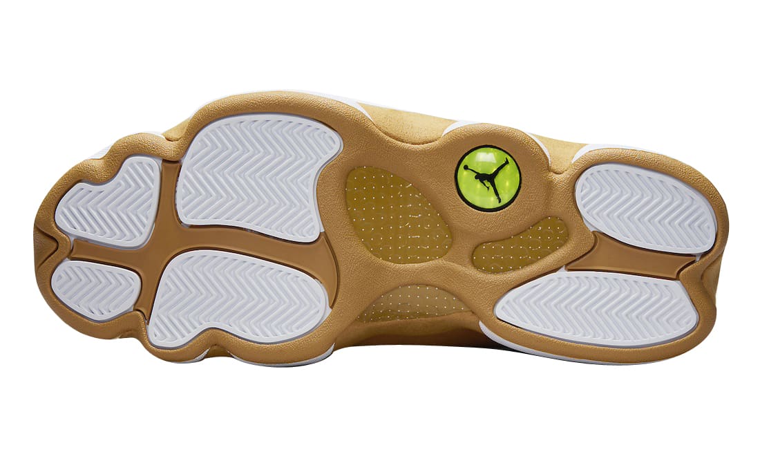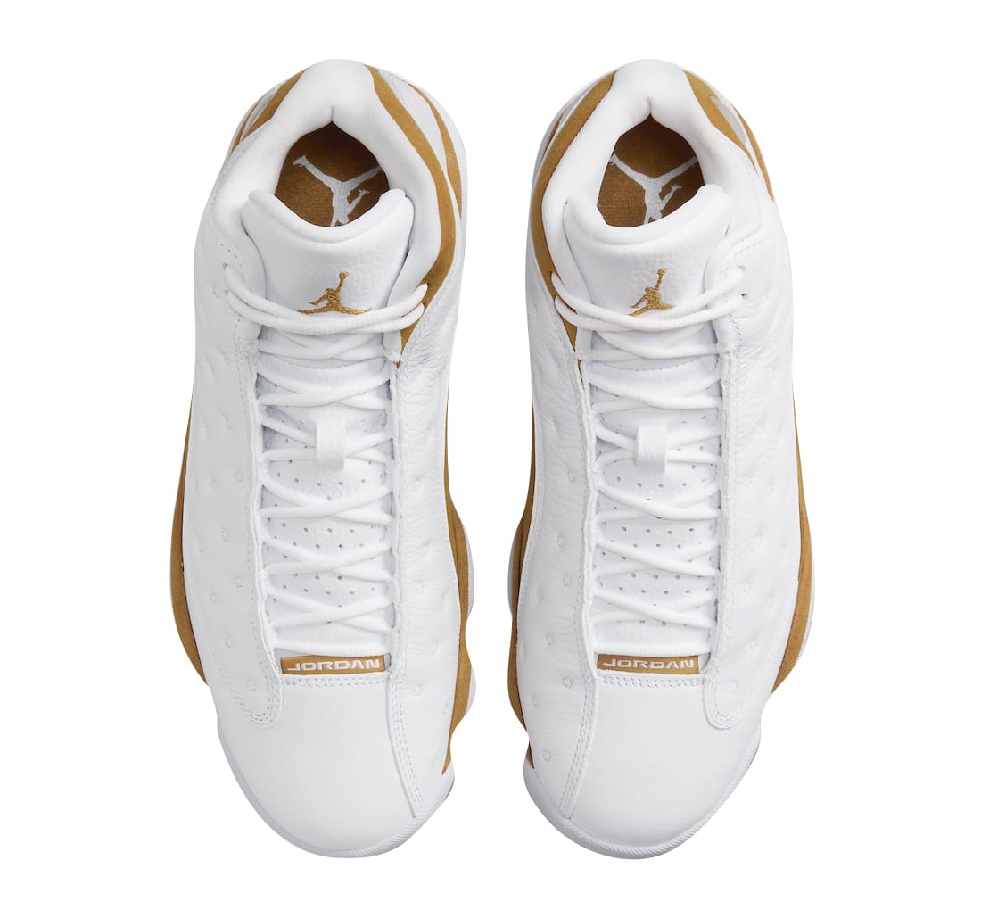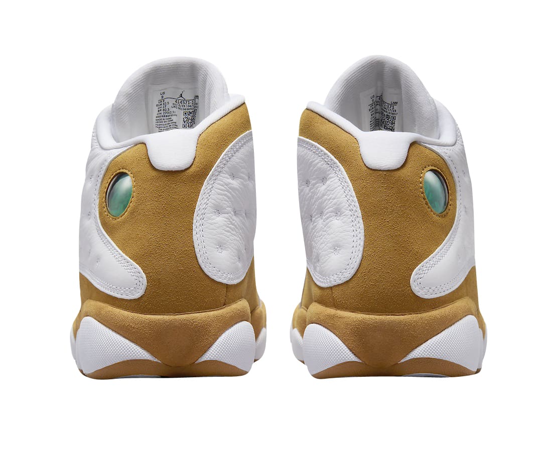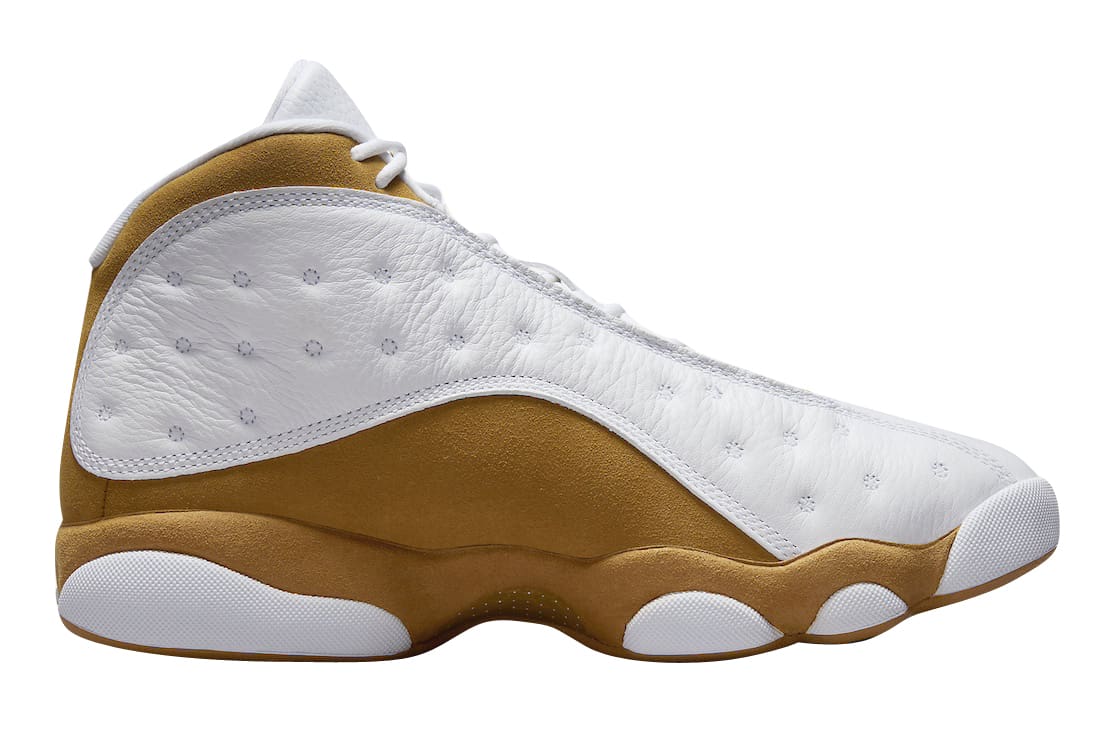 The 2023 version of the Air Jordan 13 Wheat is executed in the same manner as the OG 2004 pair. Done in White and Wheat hues, this Air Jordan 13 feature a White leather paired up with golden Wheat suede overlays on the mudguards, heels, ankles, and midsole. Matching wheat Jumpman logos on the tongues, the signature cat eye hologram on the ankles, and a wheat rubber outsole will round out the design.