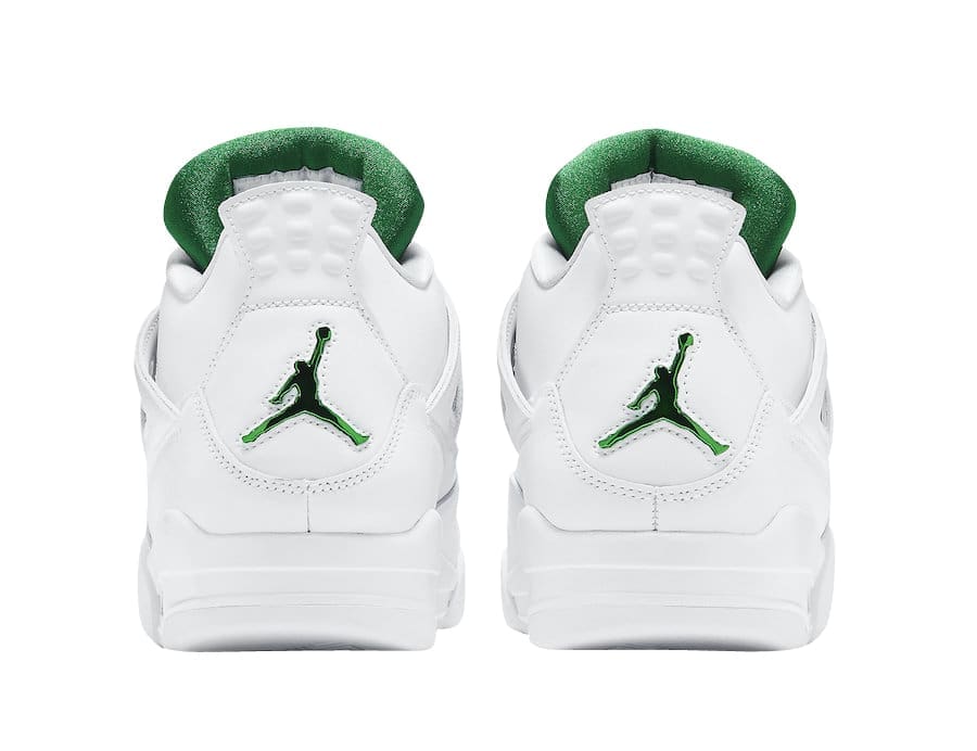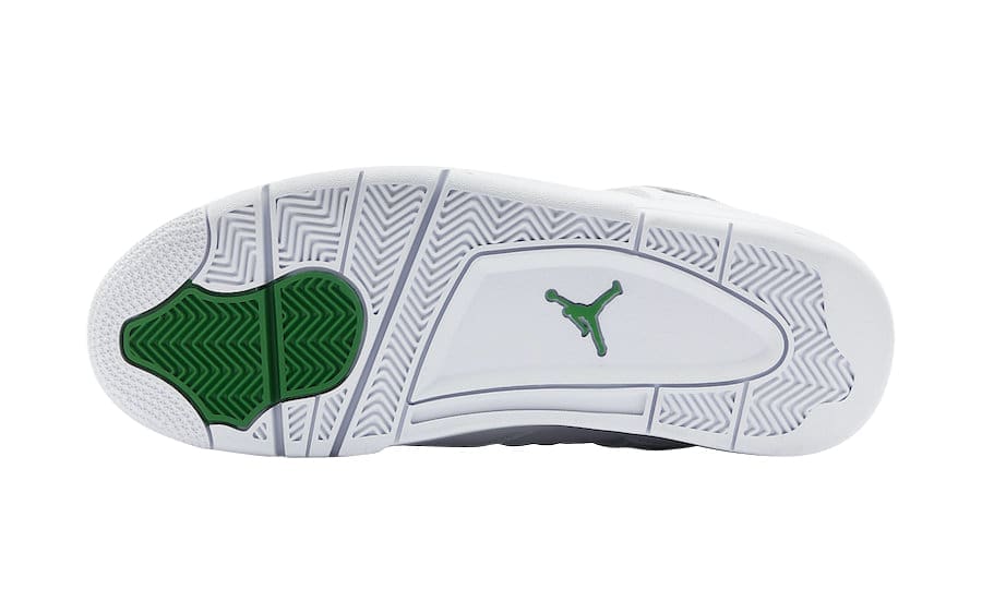 This Jordan 4 features a White leather upper with White mesh underlays and Metallic Green accents on the upper eyelets. A metallic green Jumpman logo on the heel, white outsole, and metallic green air bubble complete the design.u00a0