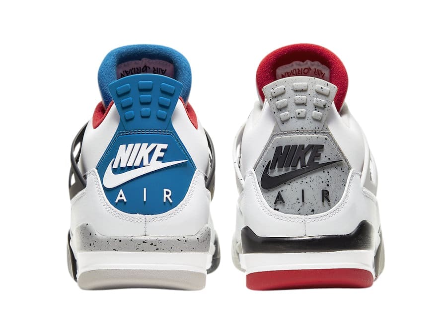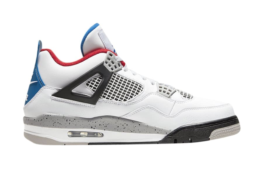 To celebrate the 30th anniversary of the Air Jordan 4, Jordan Brand released the special edition Jordan 4 Retro What The, now available on StockX. In traditional Nike fashion, this design is a mix of the most notable Jordan 4 colorways ever released. Color combinations depicted include White Cement, Army Blue, Fire Red, and Black Cement.