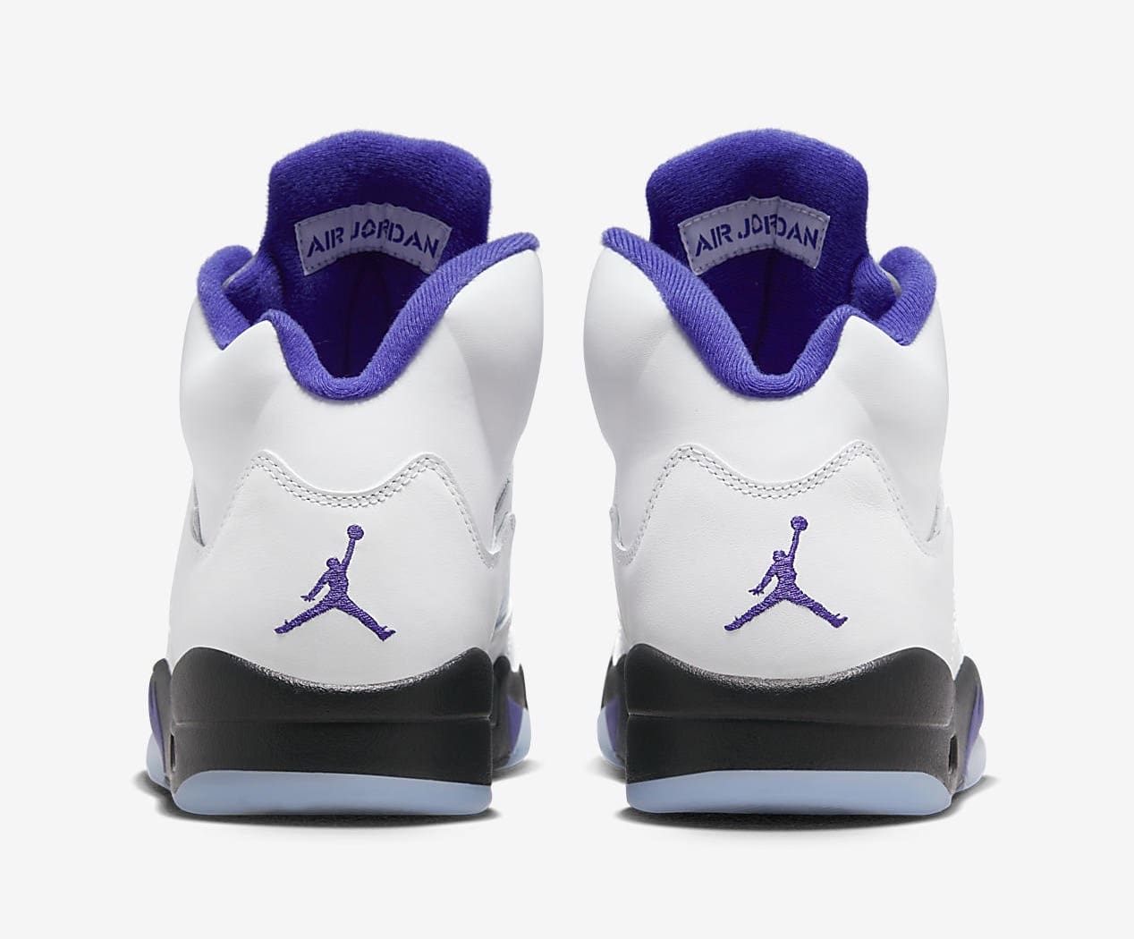Dressed in a White, Dark Concord, and Black color scheme. This offering of theu00a0Air Jordan 5u00a0features a clean White leather upper paired with Concord contrasting accents throughout and sockliner. 3M reflective tongues, Black midsole atop an icy translucent outsole completes the design.
