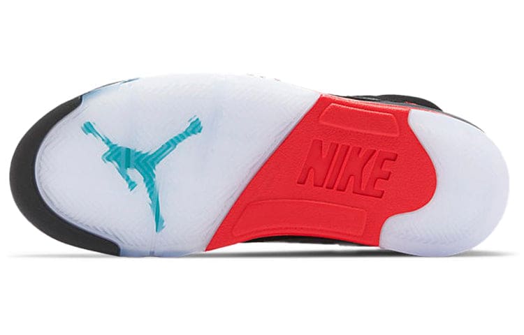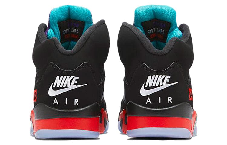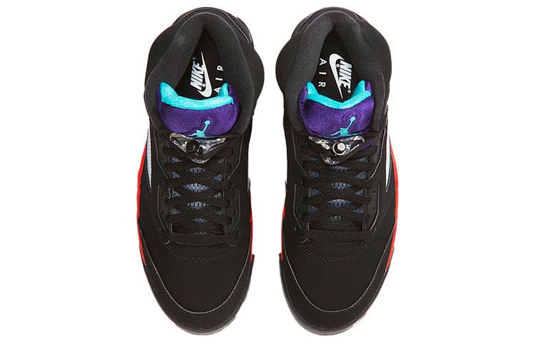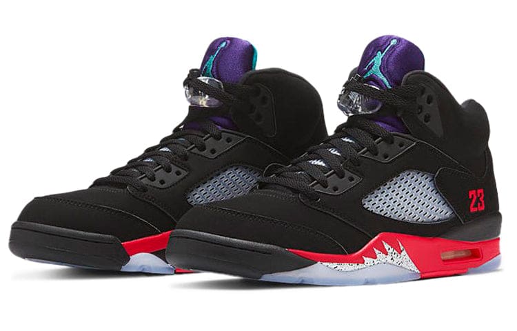 True to its name, The Nike Air Jordan 5 ��Top 3�� draws inspiration from a trio of iconic OG releases �� the ��Metallic��, ��Fire Red�� and ��Grape�� colorways. Against the black nubuck upper is a vibrant purple tongue complemented by aqua blue. On the shoe is a bright red ��23�� lettering. Equally eye-catching is the red midsole mashed up with metallic silver shark-tooth detailing.
