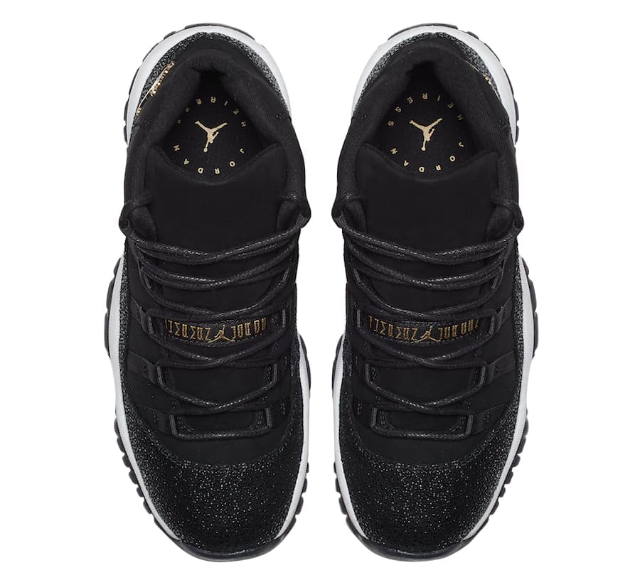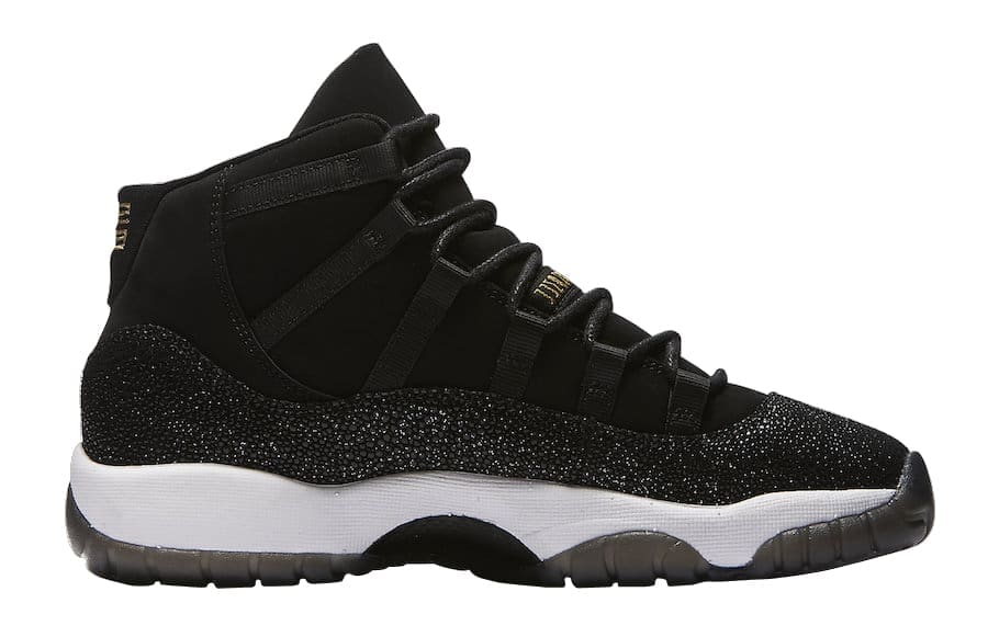 This new Air Jordan 11 colorway dubbed u201cHeiressu201d comes dressed in a mix of Black, Metallic Gold and White. What really helps the shoe stand out is the swapping of the mesh and patent leather upper for a premium suede construction that features glitter accents, Gold detailing and Black stingray detailing on the mudguard. Finishing things off are a White midsole and translucent Black outsole.