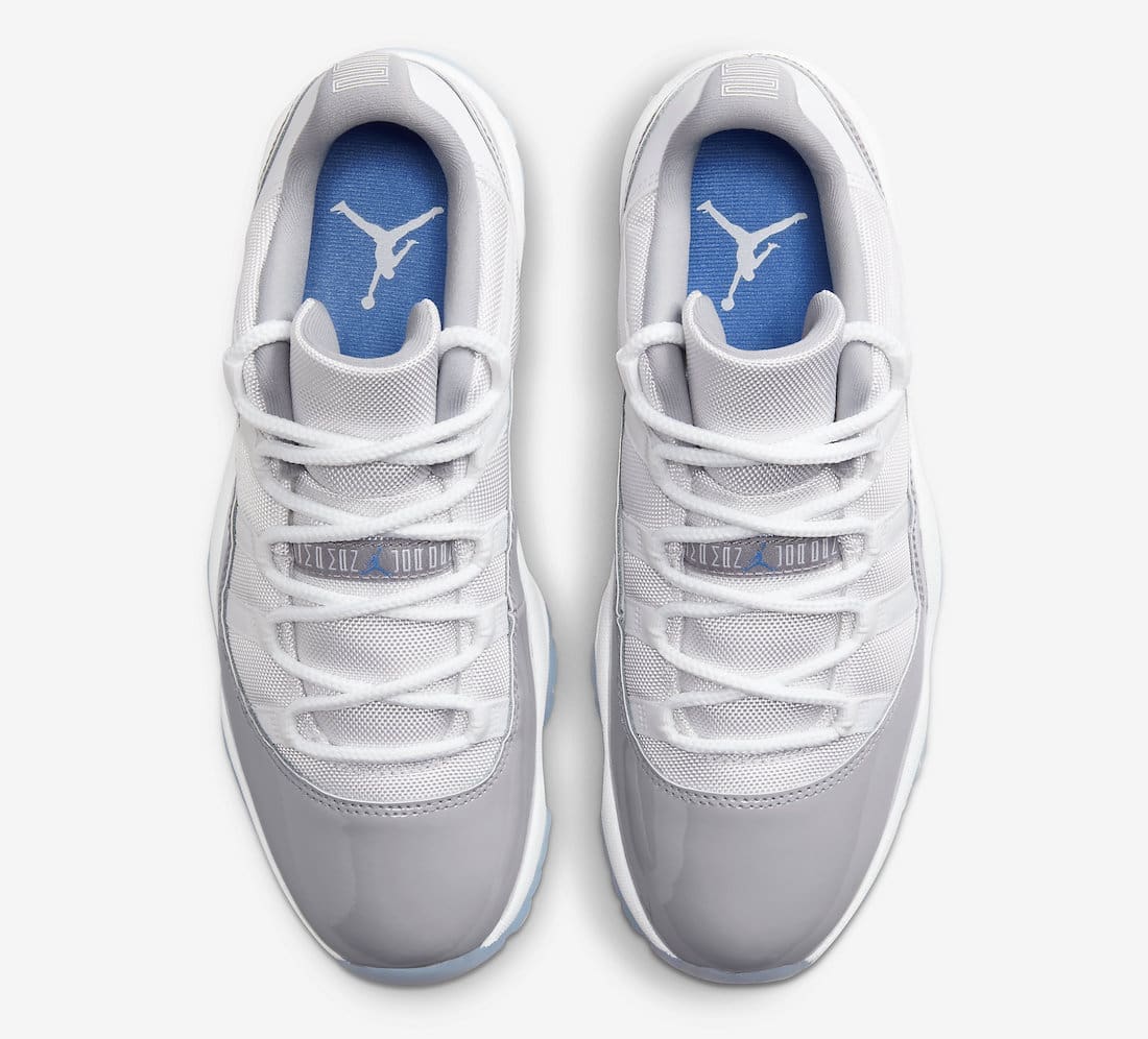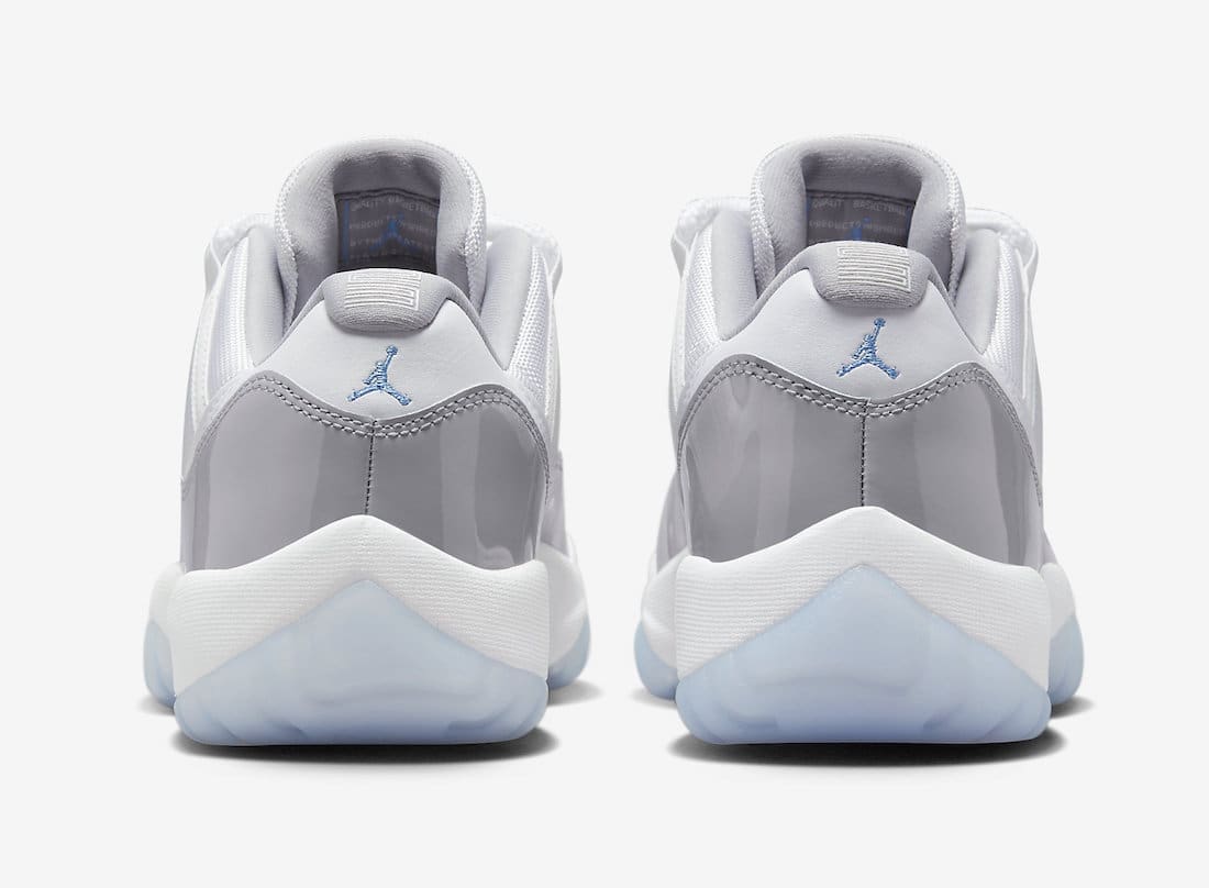 Dressed in a White, University Blue, and Cement Grey color scheme. This offering of theu00a0Air Jordan 11 Lowu00a0features a White mesh upper with leather heels detailed with Cement Grey patent leather mudguards. University Blue Jumpman branding atop a White midsole and icy outsole completes the design.