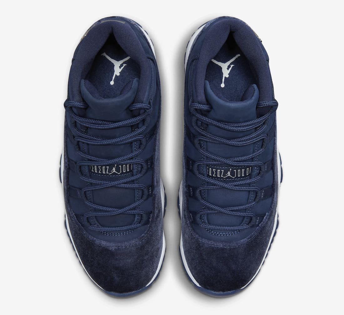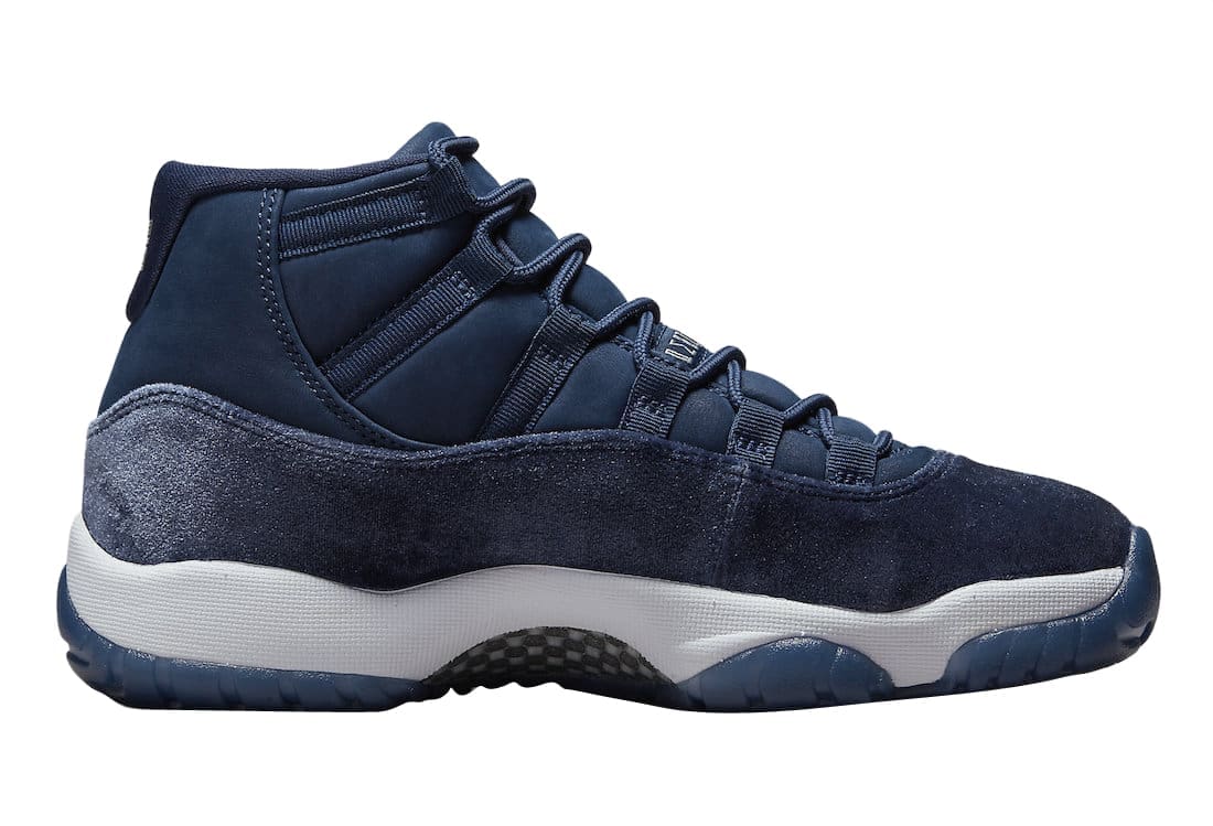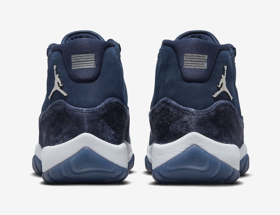 Dressed in a Midnight Navy, Metallic Silver, and White color scheme. This offering of theu00a0Air Jordan 11u00a0will resemble theu00a0Velvet u201cNight Maroonu201du00a0release from 2016. It features a Midnight Navy base with nubuck replacing the traditional mesh build as well as velvet used instead of patent leather. A White midsole atop a Navy semi-translucent outsole completes the design.