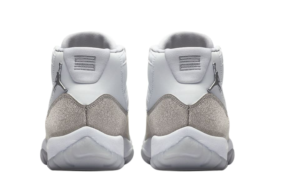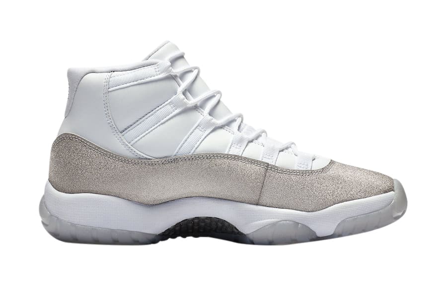 This womenu2019s-exclusive variation of the Air Jordan 11 is covered in an official theme of White, Metallic Silver and Vast Grey. This elevated rendition of the sneaker dons a white leather upper while the traditional patent mudguard is upgraded with a shiny, glittered silver finish instead for a luxe lifestyle theme. Finally, a white midsole and lightly tinted translucent outsole tops off the design.