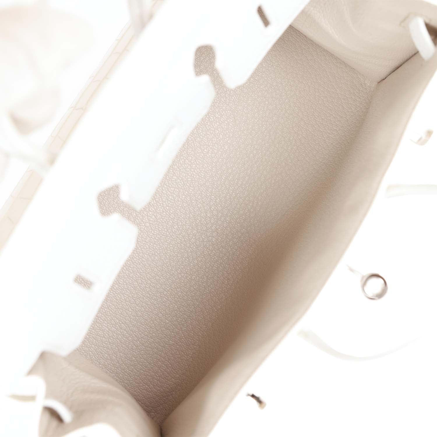 This Hermes extremely rare VIP Birkin Sac Faubourg 20cm is in a combination of five different leathers and an alligator skin with palladium hardware. The body of the bag is in white Madame calfskin; the front flap, handles and strap are in white matte alligator; the awnings, tiret and “shopping bag” clochette are in Orange H swift leather; the trim is in white Sombrero; the window panes are in Craie epsom leather and the base is in white Sombrero leather.