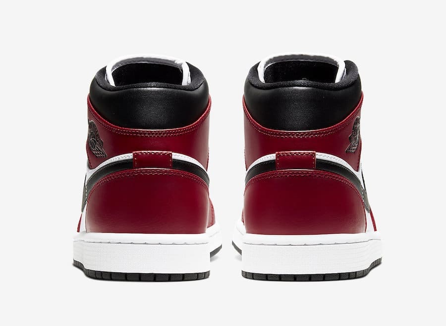 It features the same White side panels tongue, and midsole, Red overlays and tongue label with Black appearing on the ankle collar, Wings logo, laces, and Swoosh logos. But the added detail on these Mids is its Black toe and matching rubber outsole.