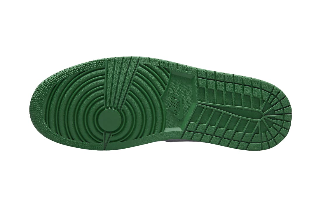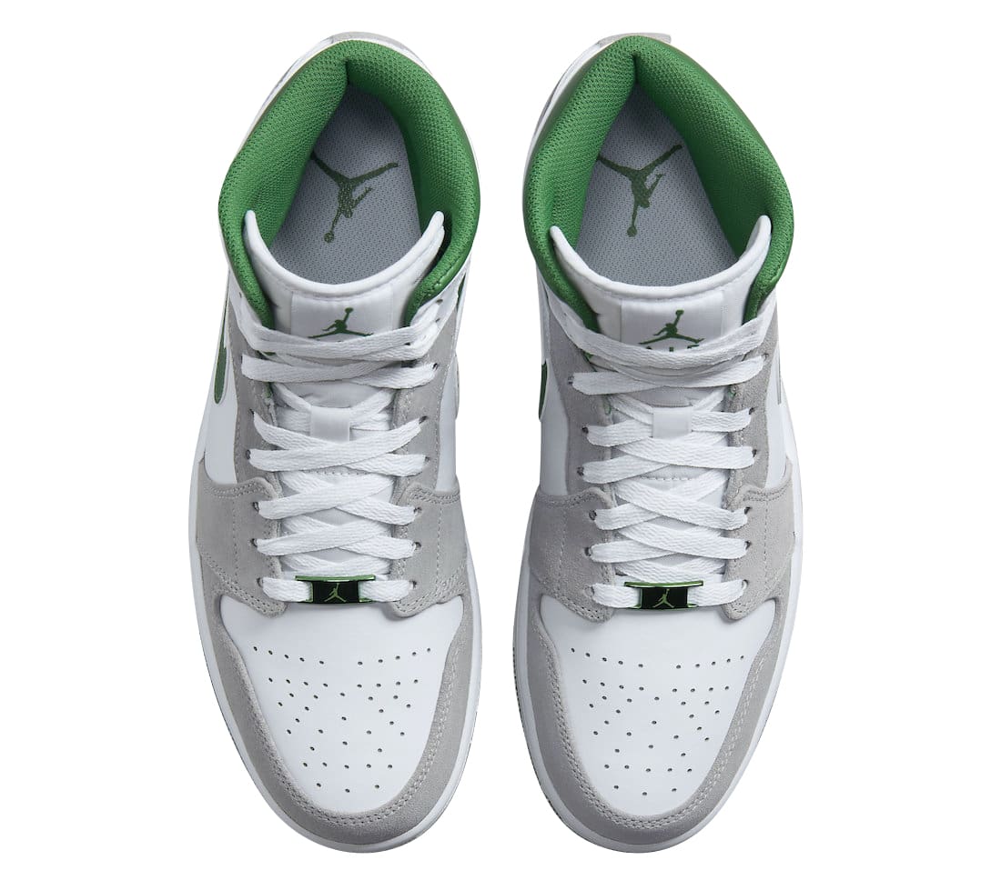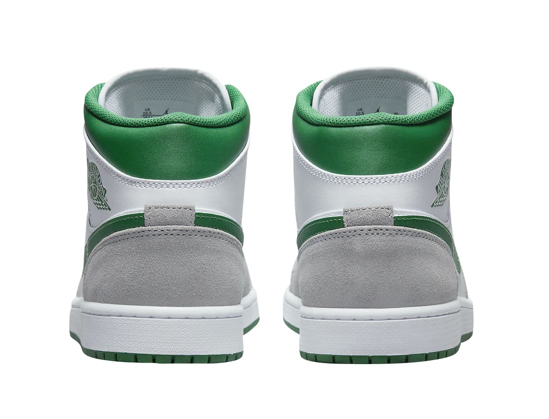 This time around the Air Jordan 1 Mid starts off with a White leather upper that is then contrasted by the Grey suede overlays as well as the Green detailing on the Swooshes, collar, Wings on the lateral ankle flap, Jumpman logos and rubber outsole. Additional White on the laces and midsole round out the main features of the sneaker.