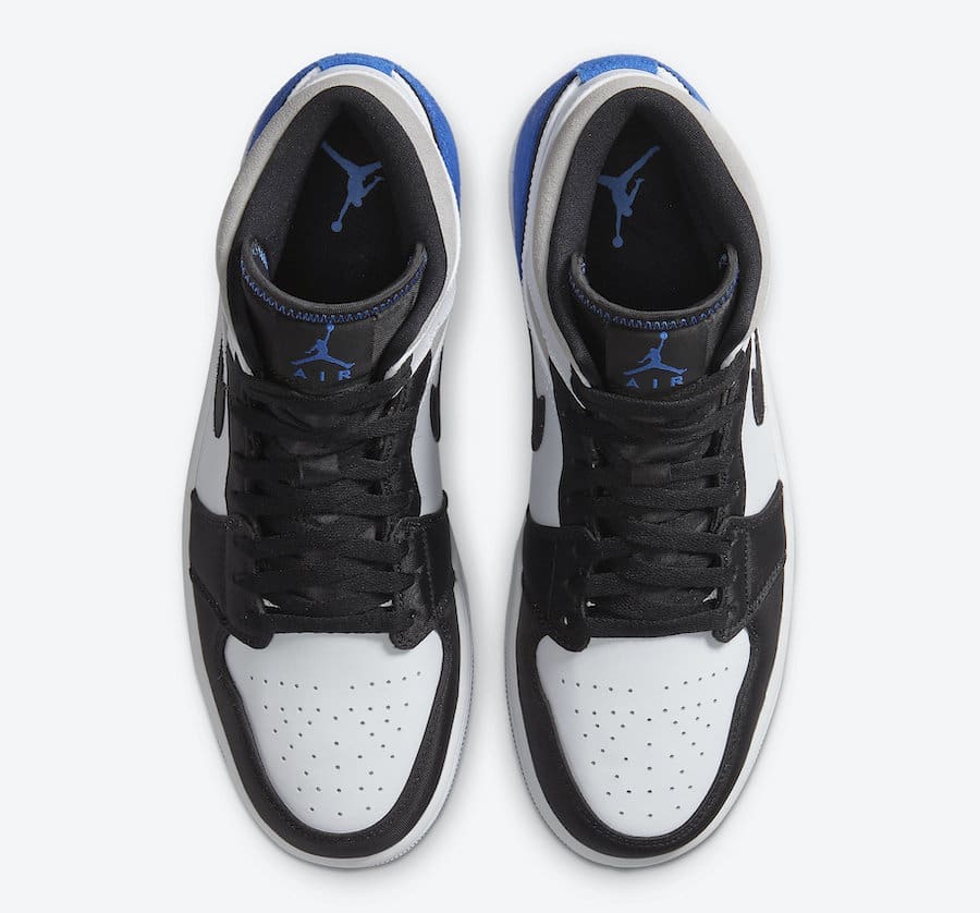 This Air Jordan 1 Mid flaunts clean white leather uppers that are offset by black nylon overlays and Swoosh logos. Suede is also utilized for grey collar and royal heel section, while more royal blue accents are prominent on the Wings logo, branding and exposed stitching on the tongues, as well as the rubber outsole to finish it off.