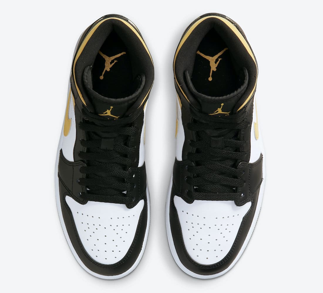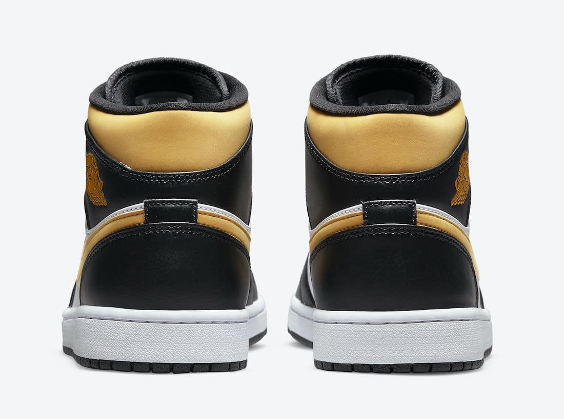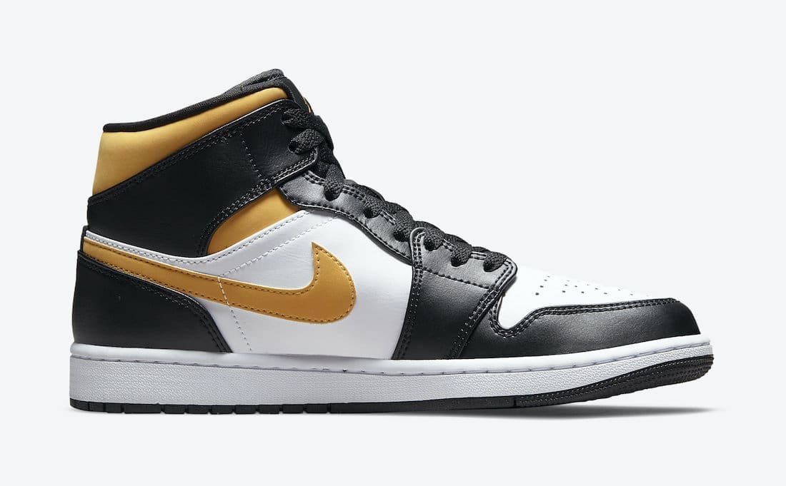 This Air Jordan 1 Mid comes dressed in a White, Black, and Pollen color scheme. Design details include White leather on the toe box and side panels paired up with Black leather overlays. The Pollen accents take care of the Swooshes, ankle collar, and Jumpman branding. A White midsole and Black rubber outsole round out the main features of the sneaker.