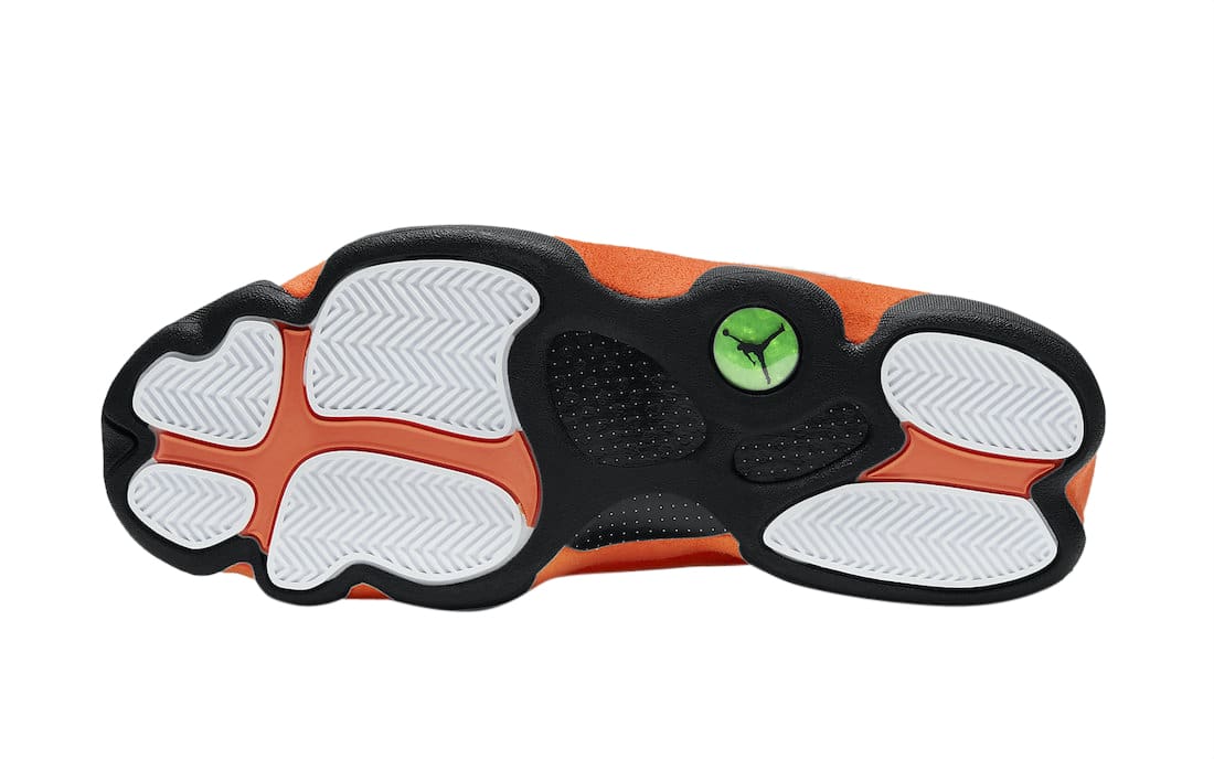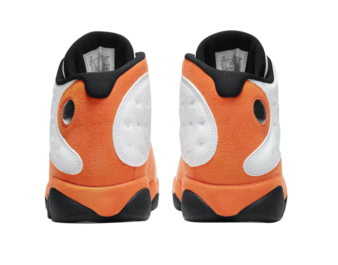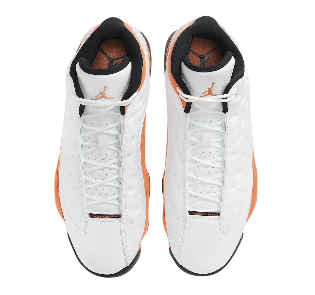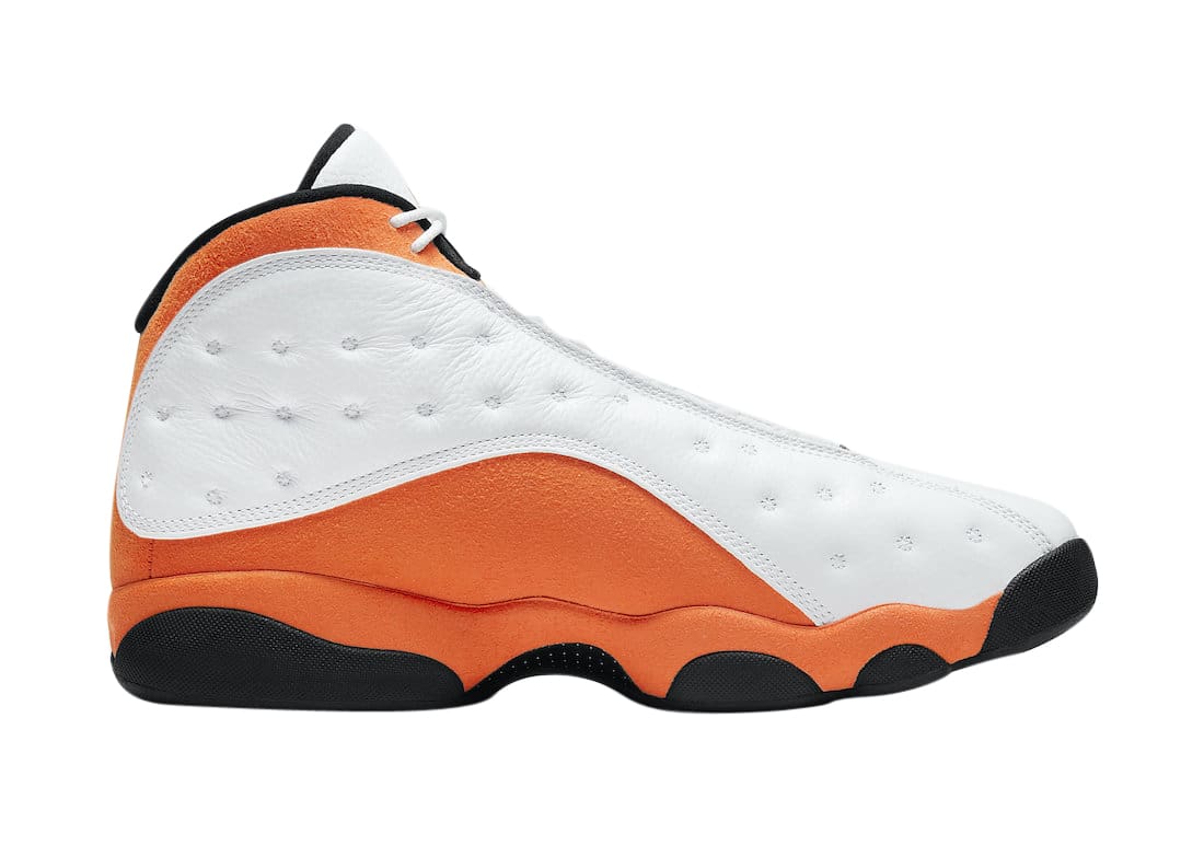 This Air Jordan 13 features a White tumbled leather construction on the upper with the signature dimple construction seen on both the medial and lateral side panels. The defining Starfish colorway is then placed on the suede mudguard and heel as well as on the embroidered Jumpman on the tongues. Black detailing on the inner liner, midsole, and outsole and the signature Jumpman hologram on the heel wrap up the look on this Air Jordan 13.