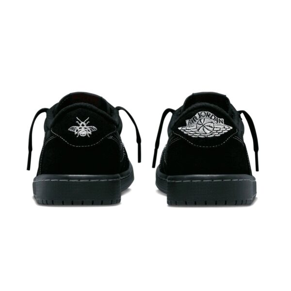 The Air Jordan 1 Low x Travis Scott Black Phantom continues the Houston rapper’s remixed series centered around Michael Jordan’s debut signature shoe. This pair sports a black nubuck upper with tonal suede overlays and contrast white stitching throughout. Scott’s signature reverse Swoosh decorates the lateral side, while the opposite side features a traditional Swoosh accompanied by Cactus Jack branding. Mismatched heel tabs display a retro Wings logo on the right shoe and an embroidered bee motif on the left. The low-top is mounted on a black rubber cupsole with stitched sidewall construction and encapsulated Air-sole cushioning.