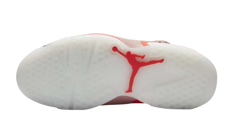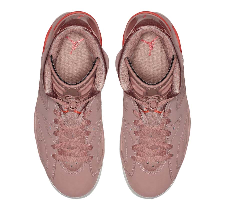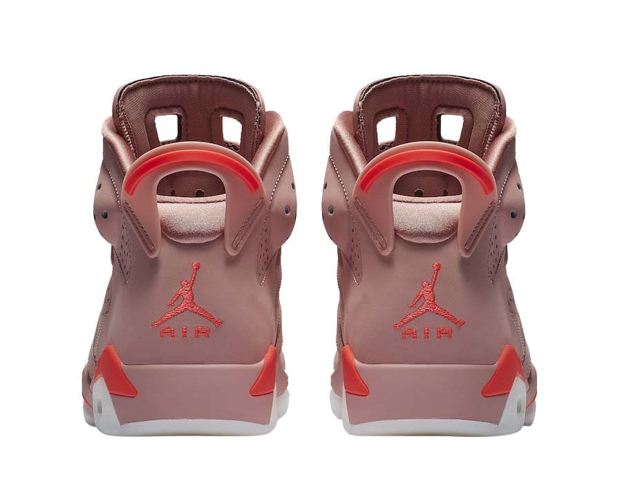 The Aleali May x Air Jordan 6 Millennial Pink features Rust Pink all throughout the upper which has been constructed out of nubuck with Bright Crimson landing on the heel tab, the Jumpman logos on the tongue and tongue lace lock, and the signature mountain peaks on the midsole. A Rust Pink midsole and a milky white translucent outsole with a Bright Crimson Jumpman on it finish off the design.