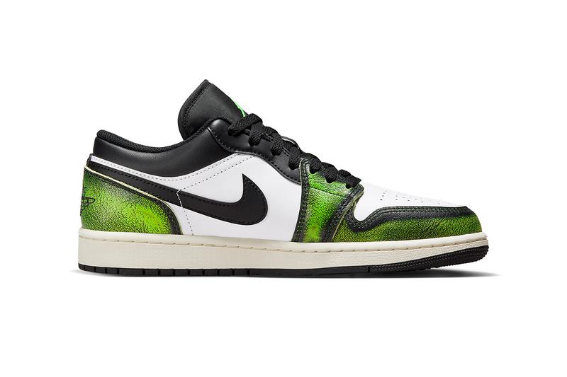 The overlays appear with solid black cracked leathers when you take them straight out of the box. However, after days of normal wear and tear, this outer layer gradually sheds off and reveals a bold u201cElectric Greenu201d underlay. Adjacent to all of that comes crisp white perforated toe boxes and quarter panels while the Swooshes, interior lining, tongues, laces and ball-and-wings logos that are parked out back come dressed in black. Another pop of neon green turns up on the Jumpman logos on the tongues for extra flair to complete its Paranorman-reminiscent color story.