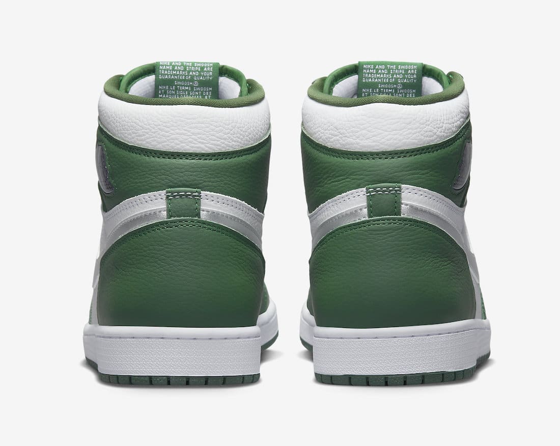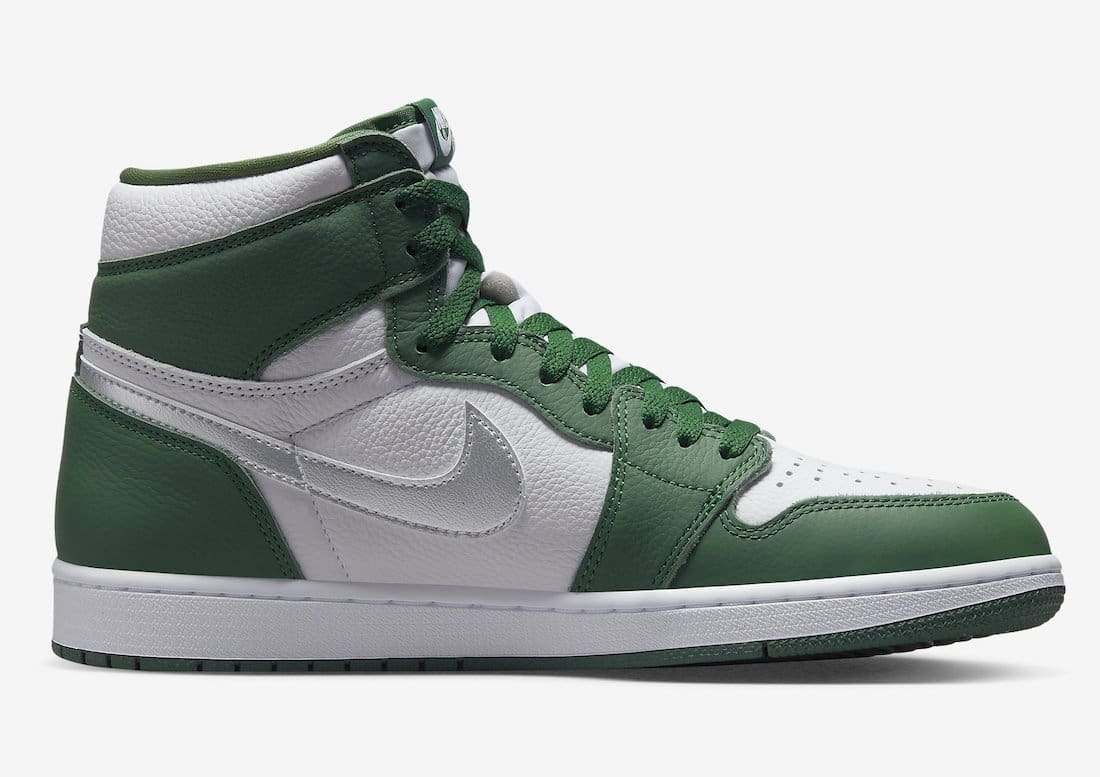 Dressed in a Gorge Green, White, and Metallic Silver color scheme. This offering of theu00a0Air Jordan 1u00a0features a White leather upper with Green overlays and Silver Swoosh and Wings logos. A White midsole atop a Green rubber outsole completes the design.