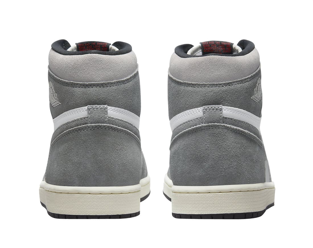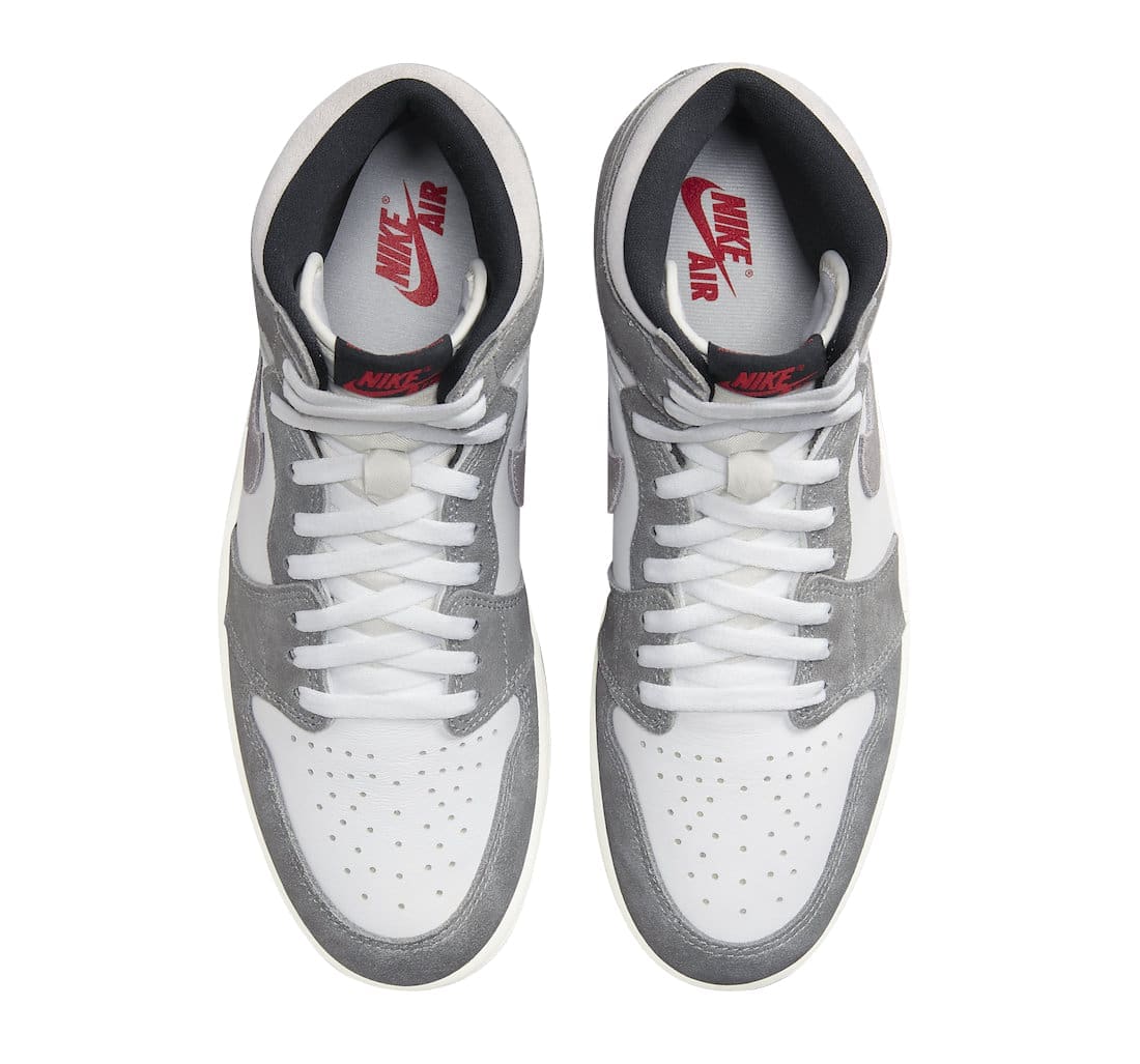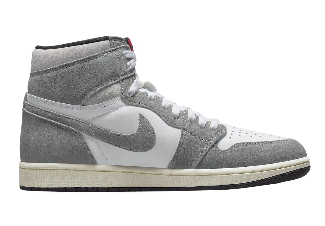 Dressed in a Black, Fire Red, White, Light Smoke Grey, and Sail color scheme. This offering of the Air Jordan 1 features a White leather base with Grey suede washed overlays, a light shades used on the collars along with Red branded tongue labels. A Sail midsole atop a Black rubber outsole completes the design.