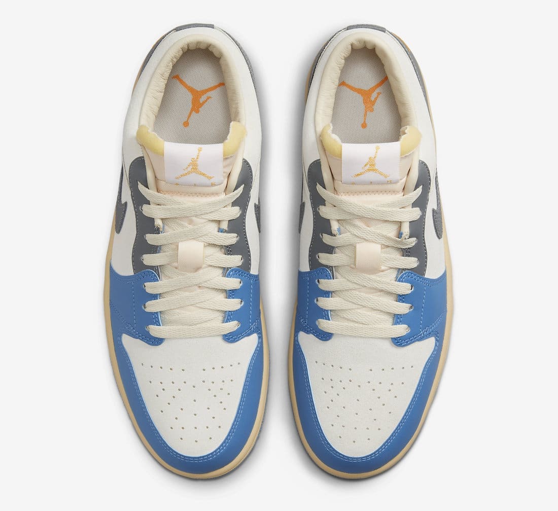 Dressed in a White, University Blue, Grey, and Sail color scheme. This offering of the low-topu00a0Air Jordan 1u00a0features a White leather base with Blue overlays up front and Grey in the rear to give it that popular split design that was used on the Union AJ1s. Other details includes padded tongues, Yellow Wings on the heels atop an aged midsole and Blue rubber outsole.