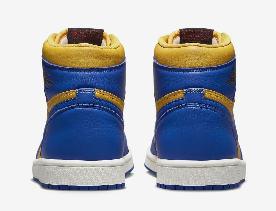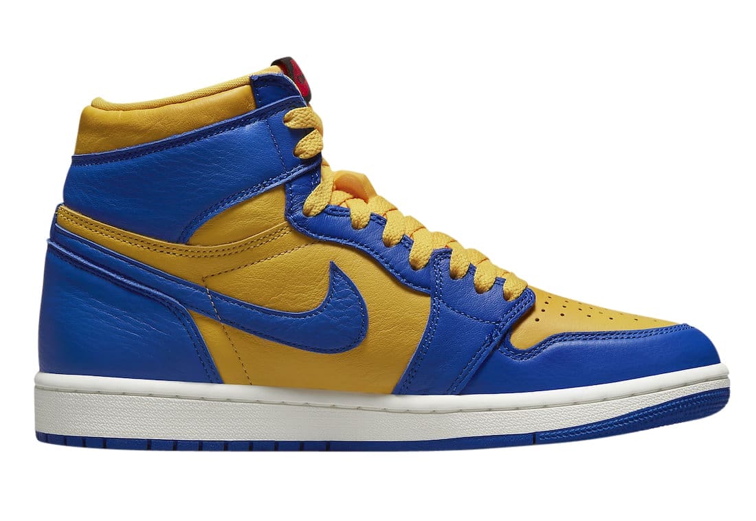 Dressed in a Varsity Maize, Game Royal, Sail, Black, and Fire Red color scheme. This offering of theu00a0Air Jordan 1u00a0is basically a u201cReverseu201d edition of 2013u2019s u201cLaneyu201d release. It features a Varsity Maize leather base with Royal Blue overlays atop a White midsole and Blue rubber outsole.