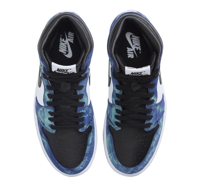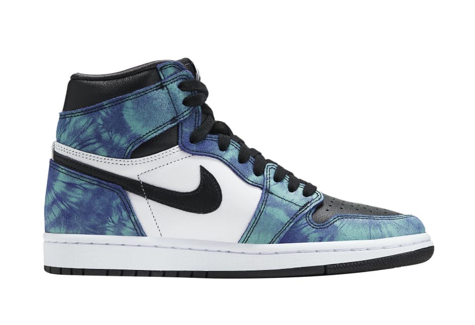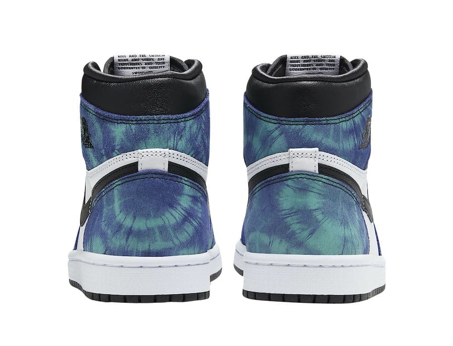 The Jordan 1 Retro High Tie Dye (W) consists of a Black and White leather upper with Blue and Green tie-dye print leather overlays. A Black Swoosh, White midsole, and Black outsole complete the design. This Jordan 1 Tie Dye was released in June 2020 and retailed for $170 USD.