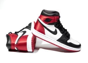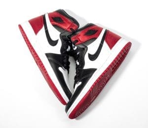 This AJ 1 features a classic ��Black Toe�� color scheme. This design is constructed from a combination of leather and satin that provides a luxurious feel. A metal Wings logo on the heel completes the design. These sneakers were released in August 2019 and retailed for $160.
