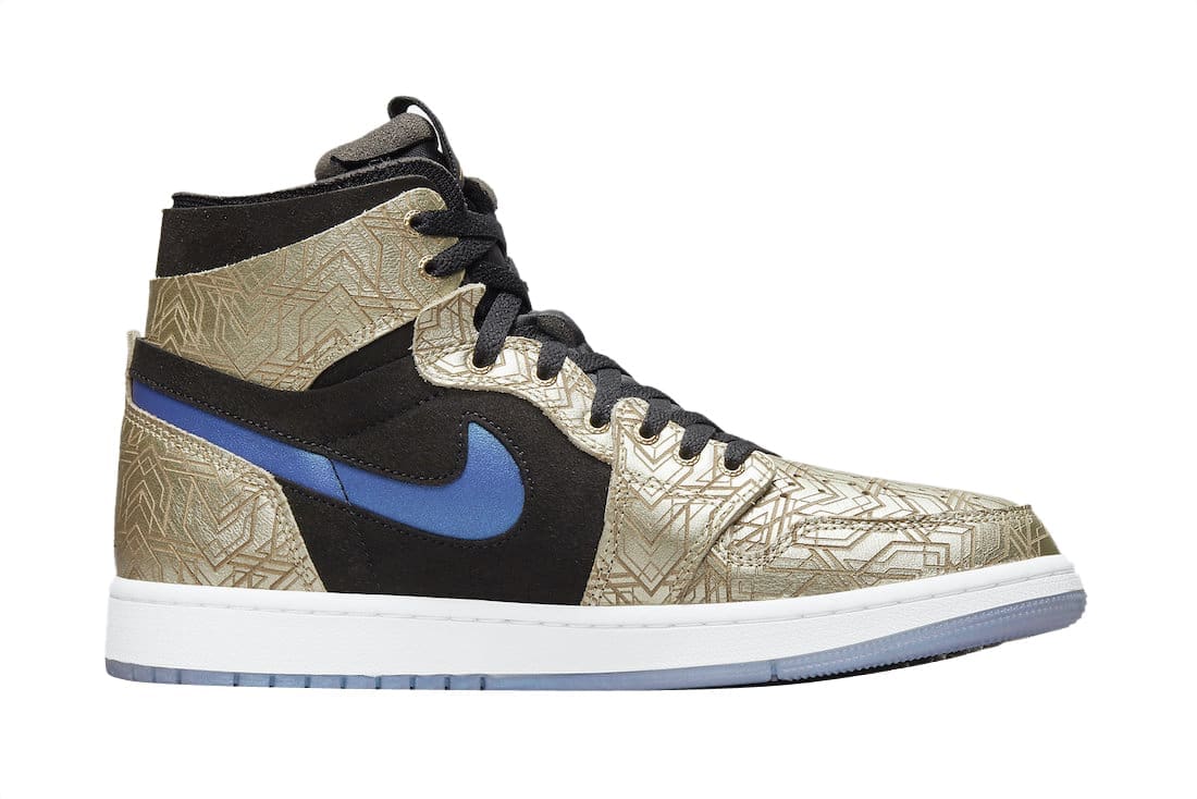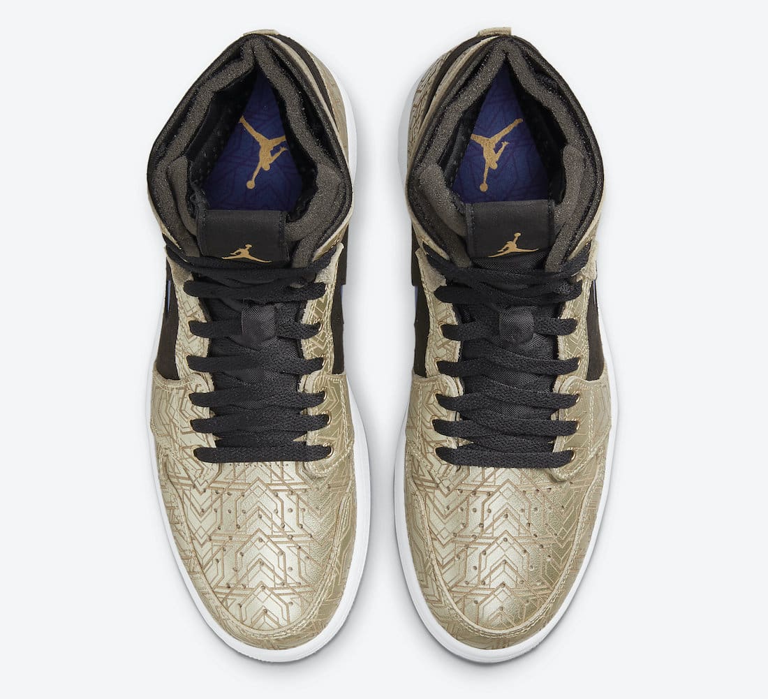 This offering of theu00a0Air Jordan 1u00a0features a Metallic Gold laser-etched pattern covering majority of the shoe with Black side panels, laces, padded tongues and collars. Royal Blue cut-out Swooshes on the sides atop a White midsole, Black rubber outsole with icy-translucent trim and graphic insoles completes the design.