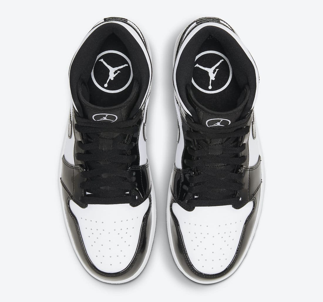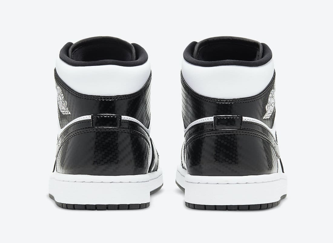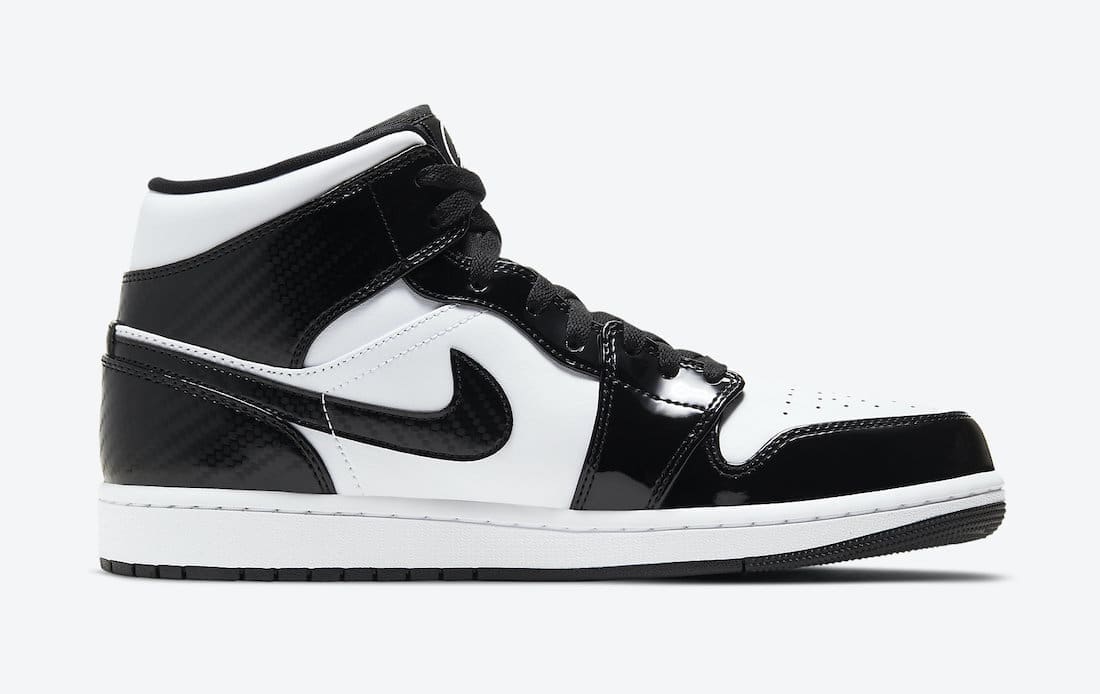 Dressed in a clean Black and White color scheme. Thisu00a0Air Jordan 1 Midu00a0features a White leather base with Black patent overlays and carbon fiber-like detailing in the rear. White Jumpman logos on the tongues and insoles, Wings logo on the ankle, a matching midsole atop a Black rubber outsole completes the design.