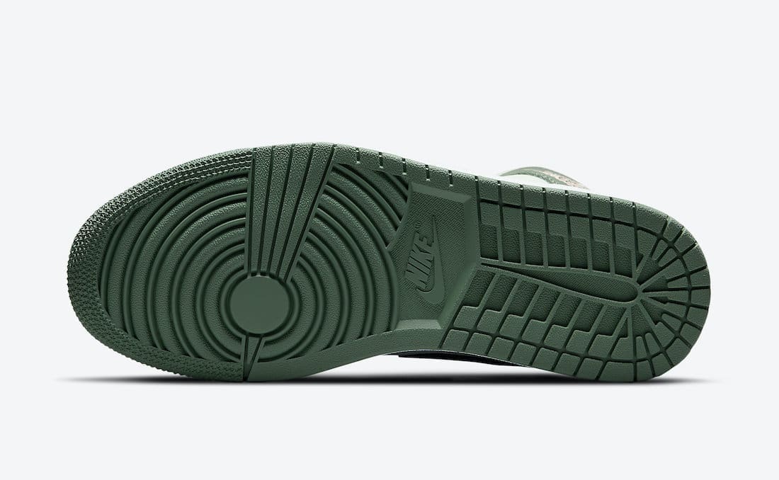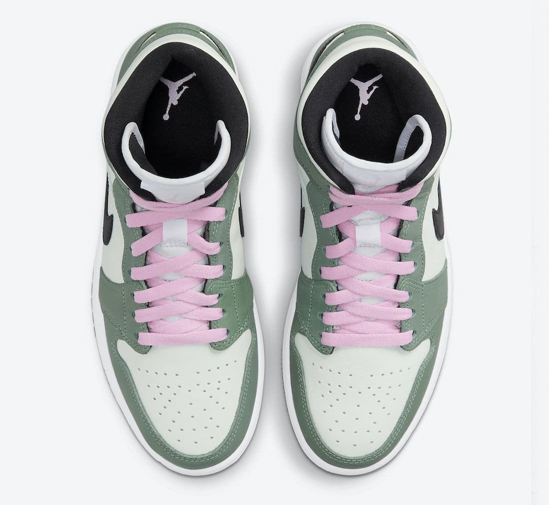 Dressed in a Dutch Green, Black, and Barely Green color scheme. This mid-topu00a0Air Jordan 1u00a0features a Barely Green leather base with Dutch Green overlays paired with Black leather Swooshes. The shoe is completed with a set of Pink laces atop a White midsole and Green rubber outsole.