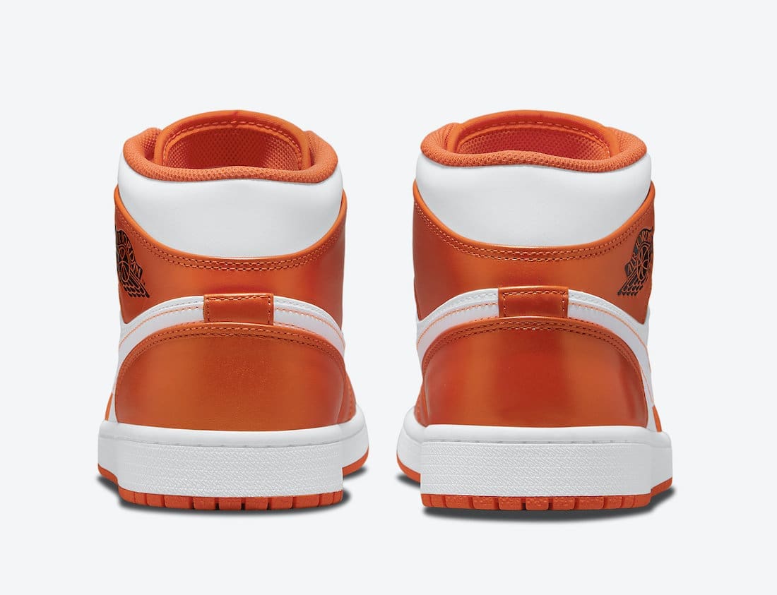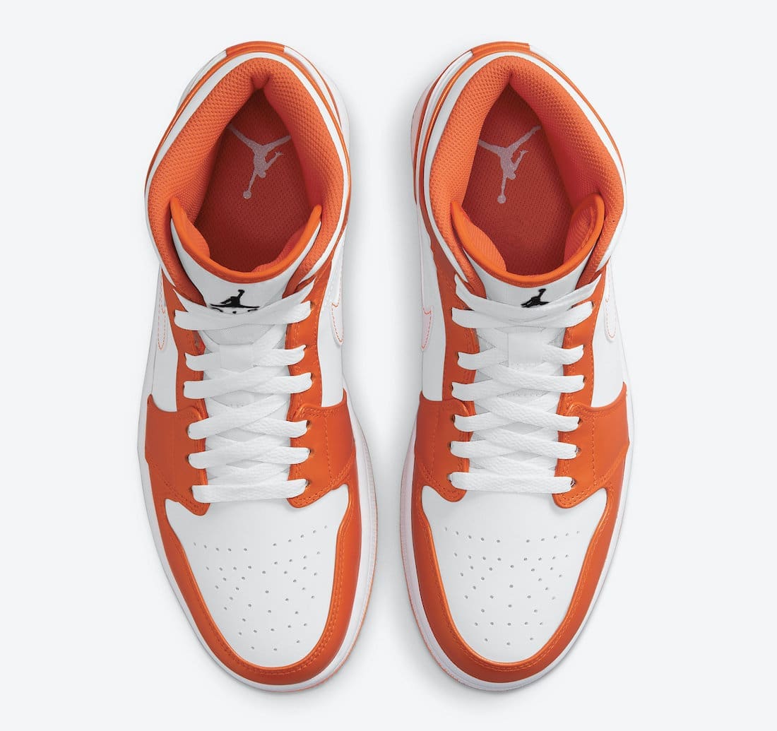 Dressed in an Electro Orange, White, and Black color scheme. This mid-topu00a0Air Jordan 1u00a0features a White leather base with Orange overlays in a Metallic-like material. Orange continues on the stitched Swooshes, insole and rubber outsole with Black Wings and Jumpman logos on the lateral ankle and tongues, respectively.