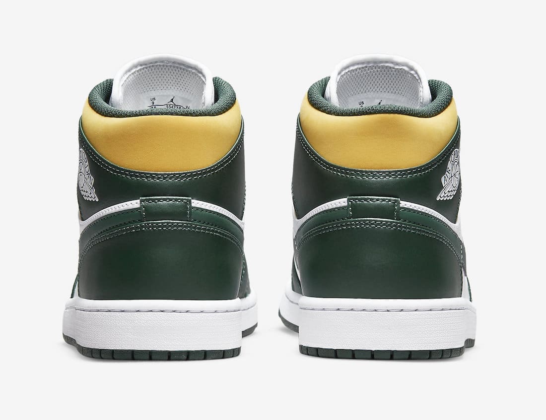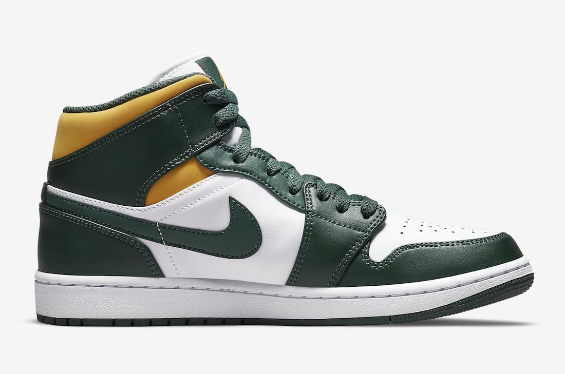 Retro basketball vibes hit this colorway of the Air Jordan 1 Mid which utilizes the team colors of the Seattle Supersonics. Constructed out of a full smooth leather build on the upper, this Air Jordan 1 Mid starts off with a White base which is then joined by a dark green on the overlays, Swooshes, laces, and the inner liner. To complete the Sonics theme we see the addition of yellow on the collar and the branding on the tongue and insoles. Down below we have a white rubber midsole and a dark green rubber outsole to finish off this Air Jordan 1 Mid.