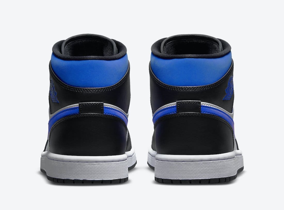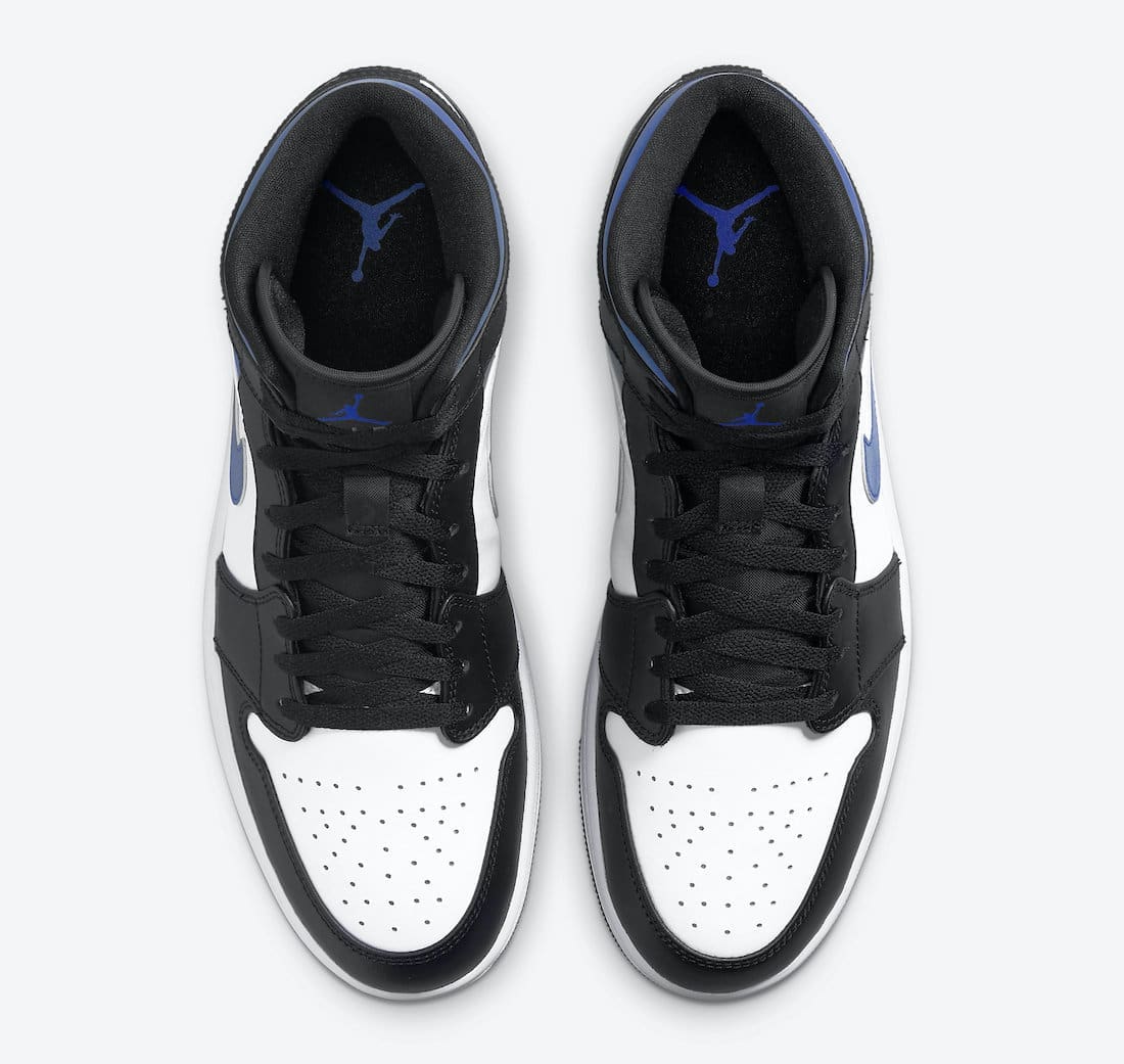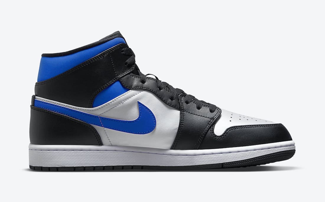 Dressed in a White, Black, and Racer Blue color scheme. This offering fo the mid-topu00a0Air Jordan 1u00a0features a White leather base with Black overlays, laces, tongues, liner and rubber outsole. Highlighting the shoe are Royal Blue contrasting accents riding atop a White midsole.