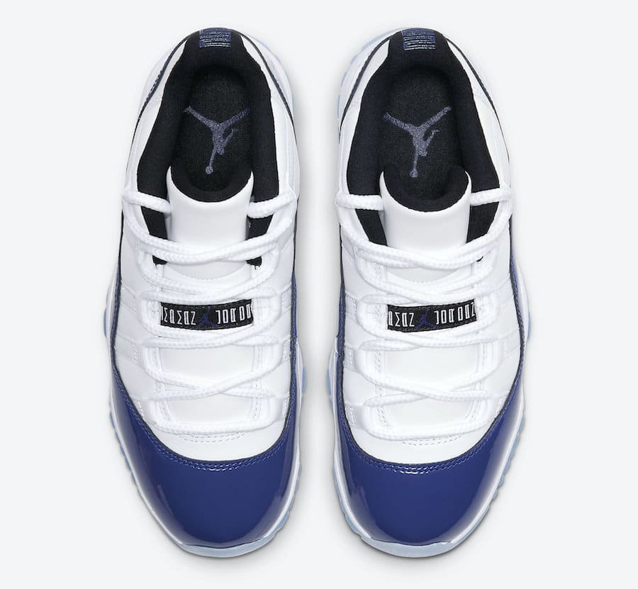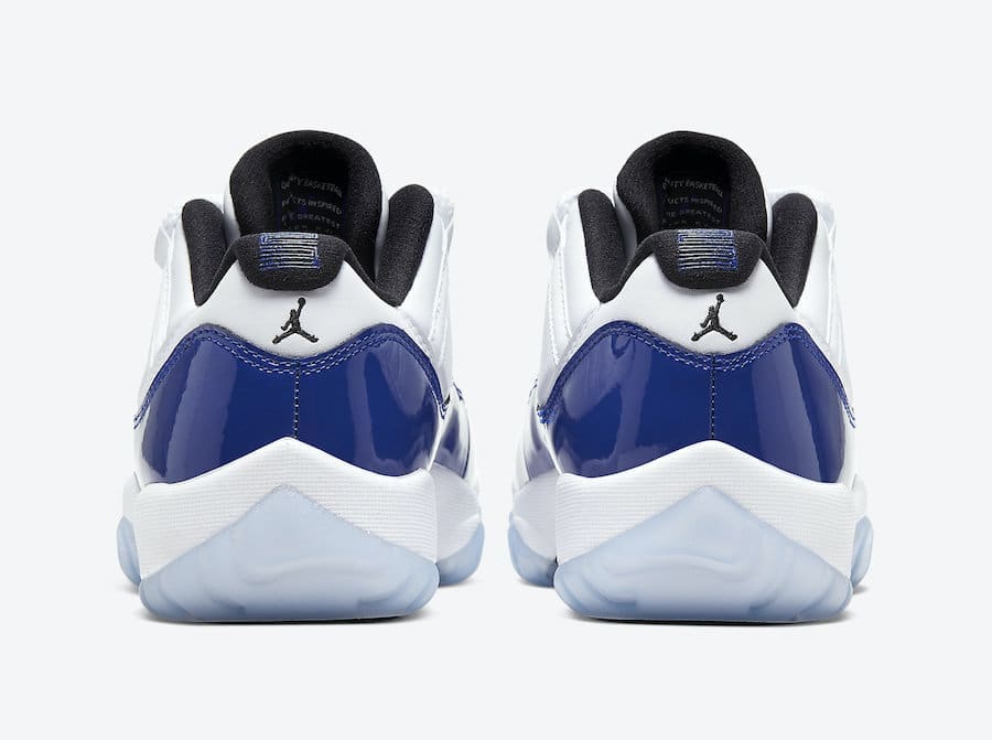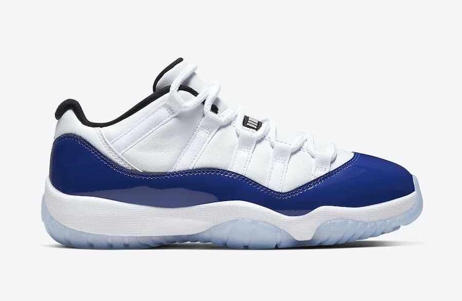 Dressed in a White, Black, and Concord color scheme. This low-topu00a0Air Jordan 11u00a0features a White upper with Concord patent leather overlays, a Black liner atop a translucent outsole.