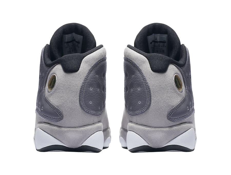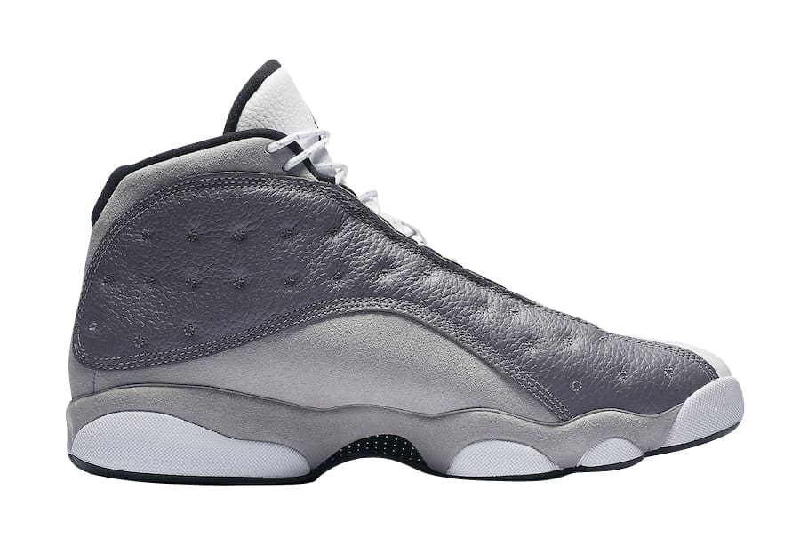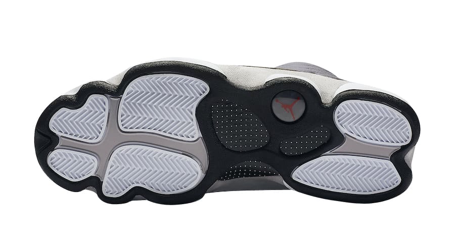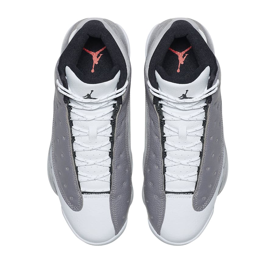 The Air Jordan 13 Atmosphere Grey comes dressed in an Atmosphere Grey, White, University Red and Black color scheme. The makeup of the consists of a Dark Grey leather upper with a lighter shade of Grey used for the mudguard and heel region. Adding contrast to the shoe is the White leather toe, Black lining, Red accents and of course the signature hologram heel logo.
