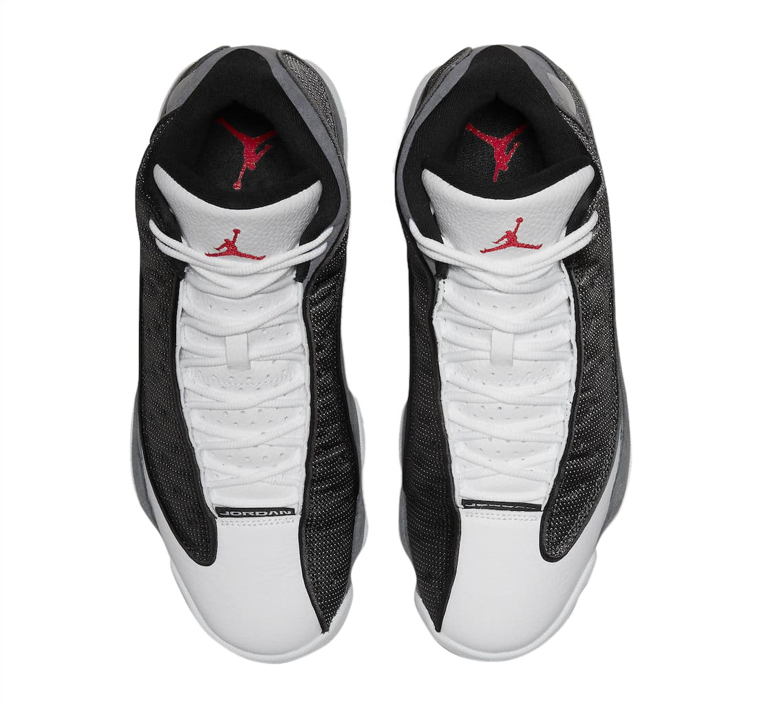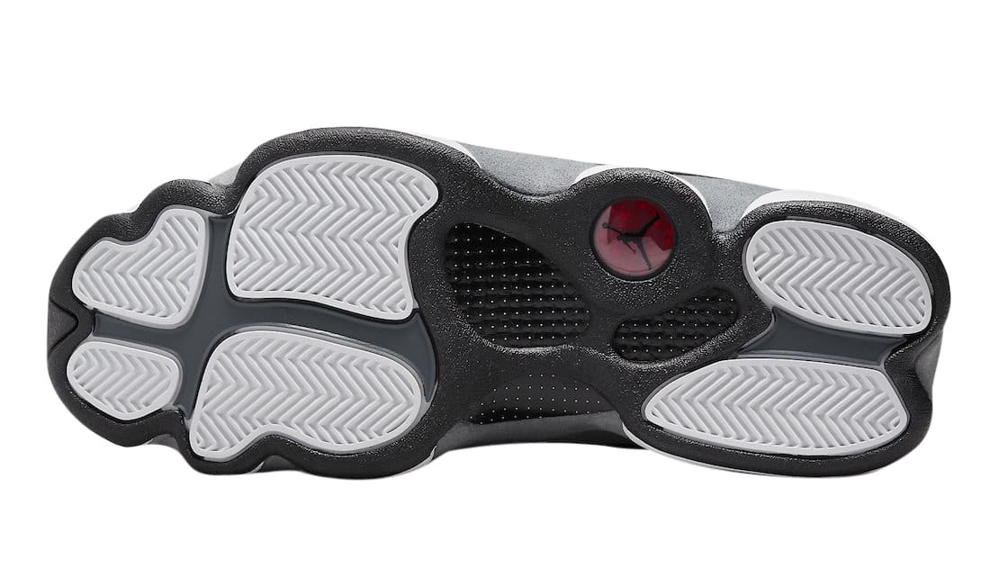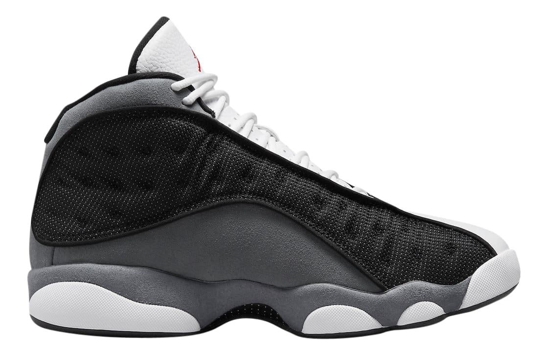 The Air Jordan 13 Black Flint comes dressed in a Black, University Red, Flint Grey, and White color scheme. It is given a White leather upper, Black 3M reflective mesh on the side panels and Flint Grey suede on the mudguards and heels. Some Red branding hits, a White midsole and Black rubber outsole is also in play.