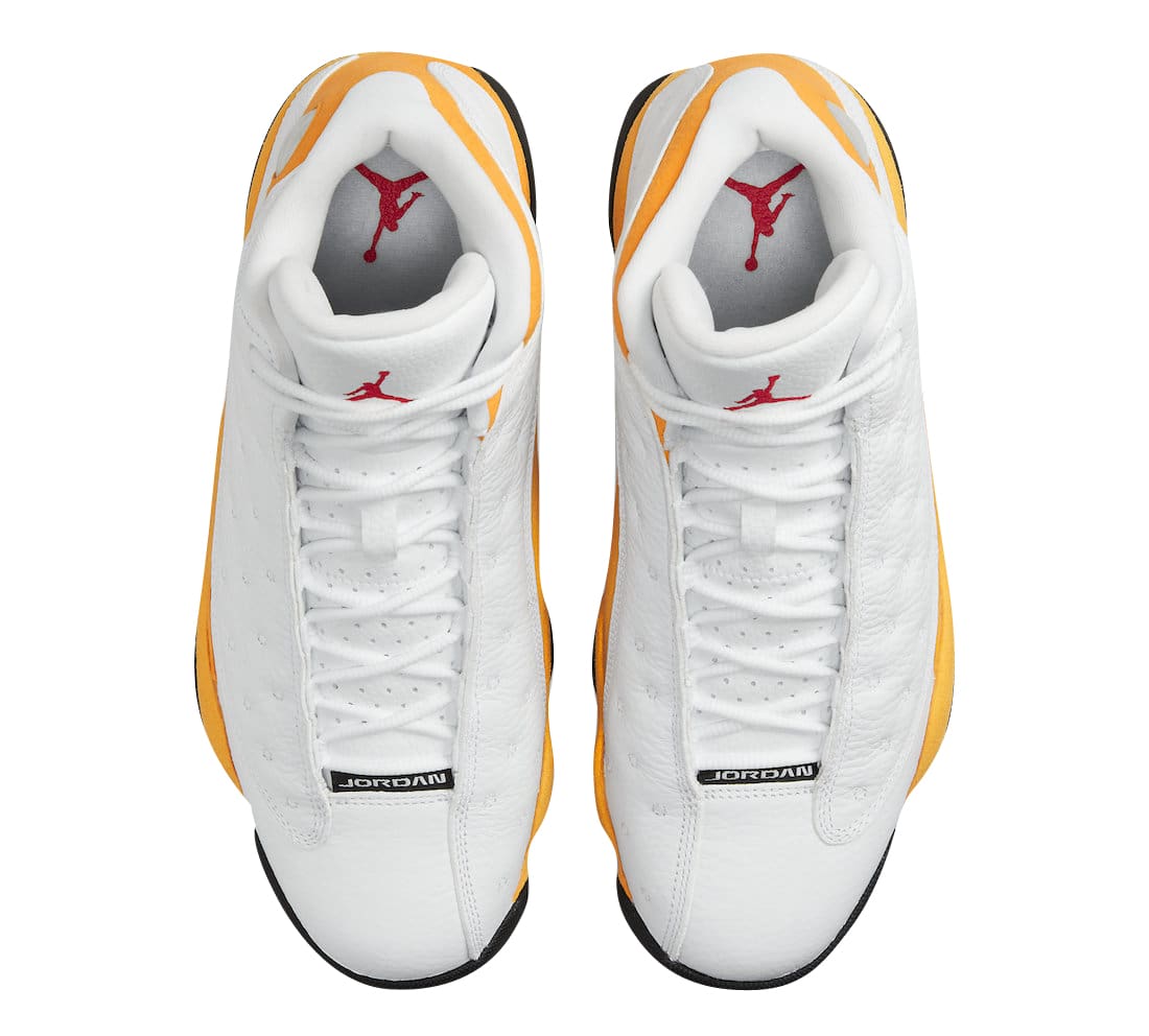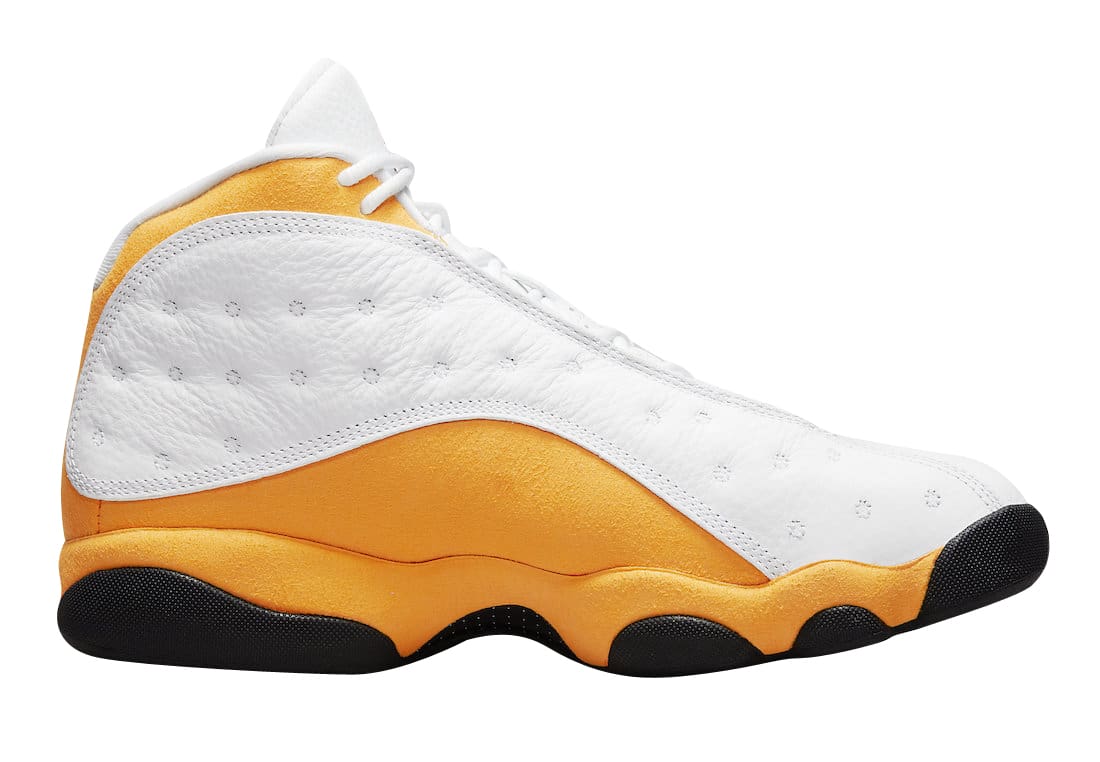 This u201cDel Solu201d iteration of the Air Jordan 13 comes dressed in a White, University Red, Del Sol, and Black color scheme. Opting for a clean base, the sneaker dons White leather on the panels, toe, and tongues with a matching liner. Adding a vibrant aesthetic to the sneaker are the hits of Yellow (Del Sol) noted on the suede overlays, while hits of Red are spotted on the Jumpman on the tongue. White laces and a Black rubber sole complete the look.