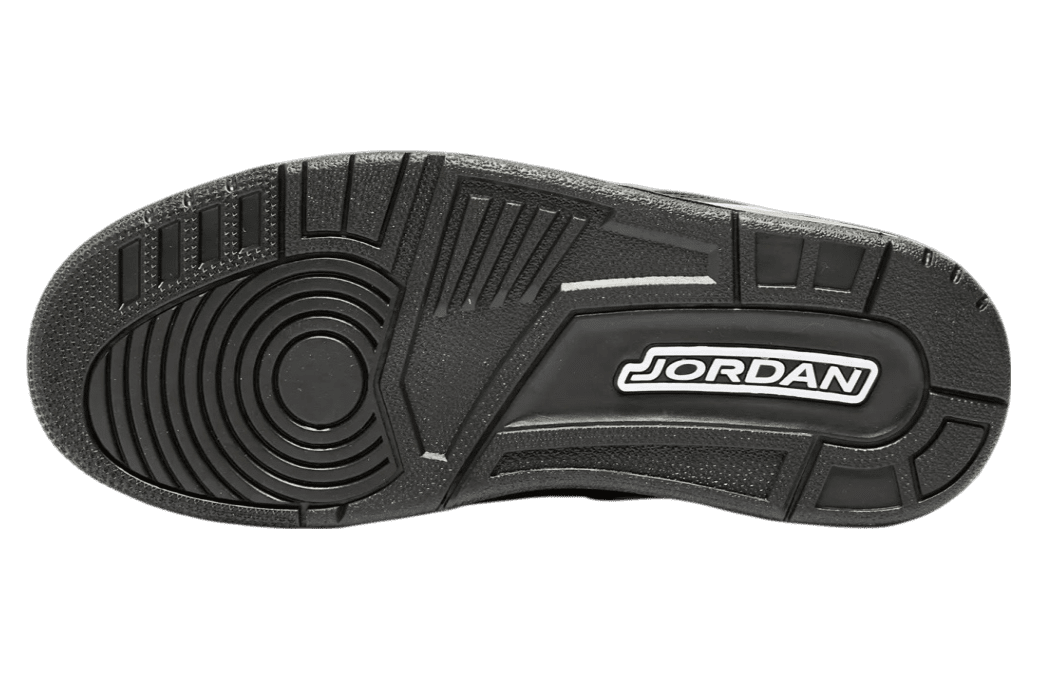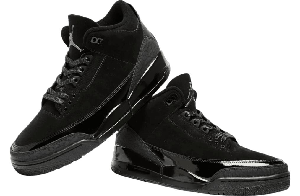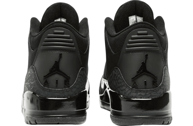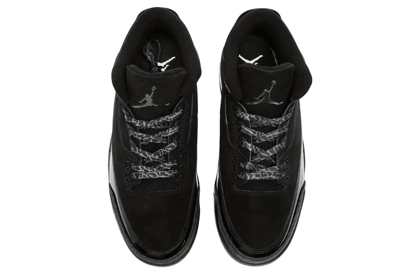 Adorned in a sleek Black and Dark Charcoal palette, the Air Jordan 3 boasts a nubuck upper, elephant print, and patent leather overlays. The all-Black design dominates, save for the White Jordan branding on the outsole. The laces, featuring the iconic elephant print, contribute to the overall thematic coherence. A solid Black rubber sole with visible Air units in the heels seals the deal.
