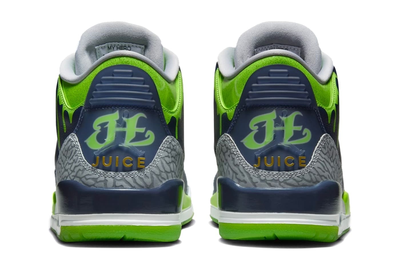 Hugo u201cJuiceu201d Covarrubias Molina, the designer behind theu00a0Air Jordan 3u00a0in this collection, drew inspiration from the Seattle Seahawksu2019 team colorsu2014navy blue and slime green. The latter color descends down the ankle as a nod to the young boyu2019s nickname. Additionally, Juiceu2019s love for flashy jewelry is reflected in the hang-tag, which is impressively plated with 24-carat gold. The outsole of the shoe features a powerful message: u201cItu2019s okay to be different,u201d serving as a source of inspiration for Hugo as he copes with his Klippel-Trenaunay syndrome condition.