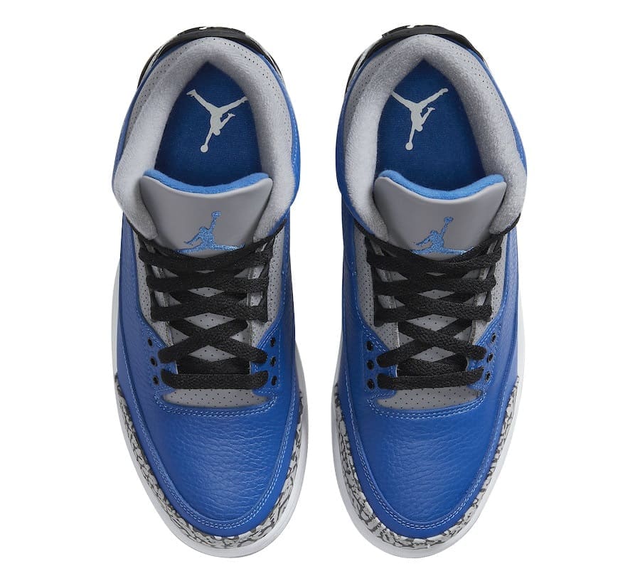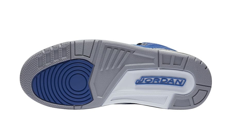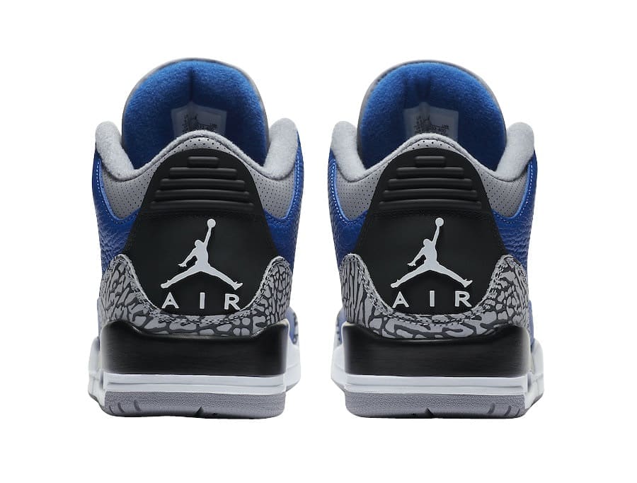 The Air Jordan 3 Blue Cement comes with an official color scheme listed as Varsity Royal/Varsity Royal-Cement Grey. It comes with a Varsity Royal tumbled leather upper with elephant print overlays. Adding some contrast to the shoe is the Black detailing found on parts of the shoe such as the laces, heel tab and part of the midsole. White accents are also found on the rest of the midsole and the Jumpman branding on the heel. Cement Grey takes care of the lining, eyestay, tongue, most of the outsole and collar.