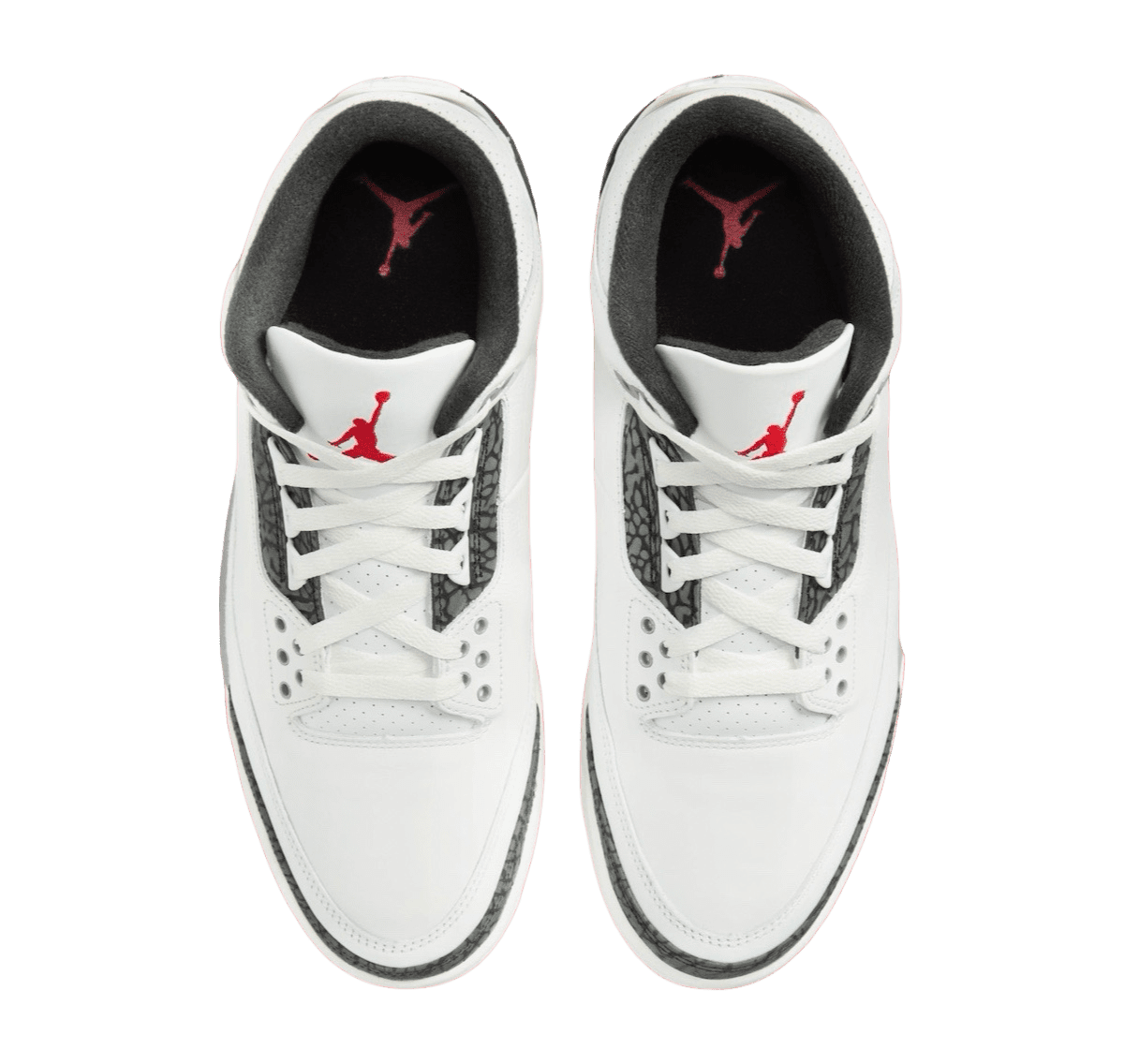 The Air Jordan 3, featuring a crisp White tumbled leather base, draws attention with vibrant Fire Red accents on the iconic Jumpman logos adorning the tongues while Black covers the heel tabs. Adding a touch of familiarity, Cement Grey embellishes the eyelets, inner lining, and a section of the midsole. The classic elephant print in a darker hue maintains its original placements on the eyestay, toe, and heel overlays.