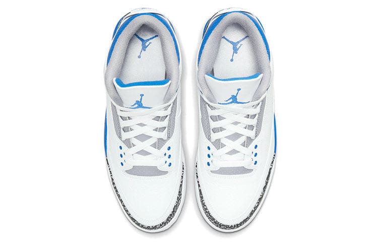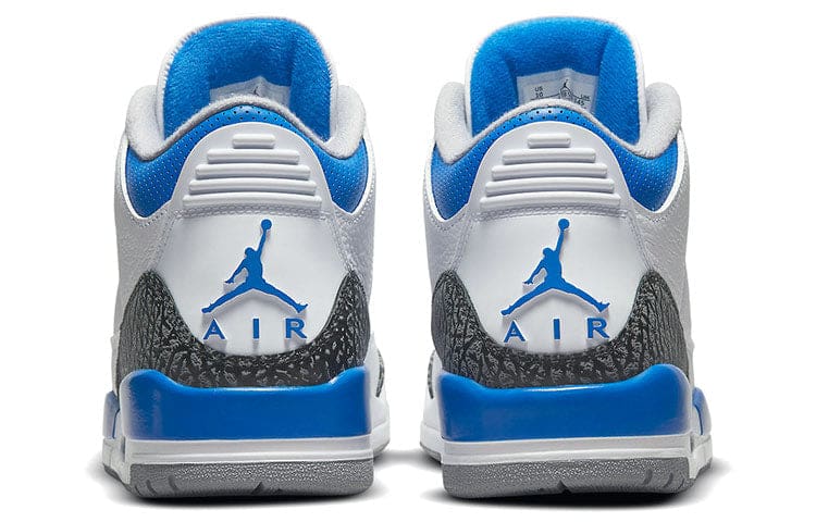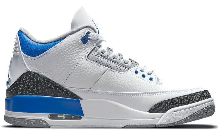 The u201cRacer Blueu201d hue stands out overtly over the perforated collars, Jumpman logos on the heel, and tongues counters as well as on the eyelets. This Air Jordan 3 also highlights a white leather base with black 3M reflective elephant print overlays featured with Blue contrasting accents atop a signature Grey rubber outsole.