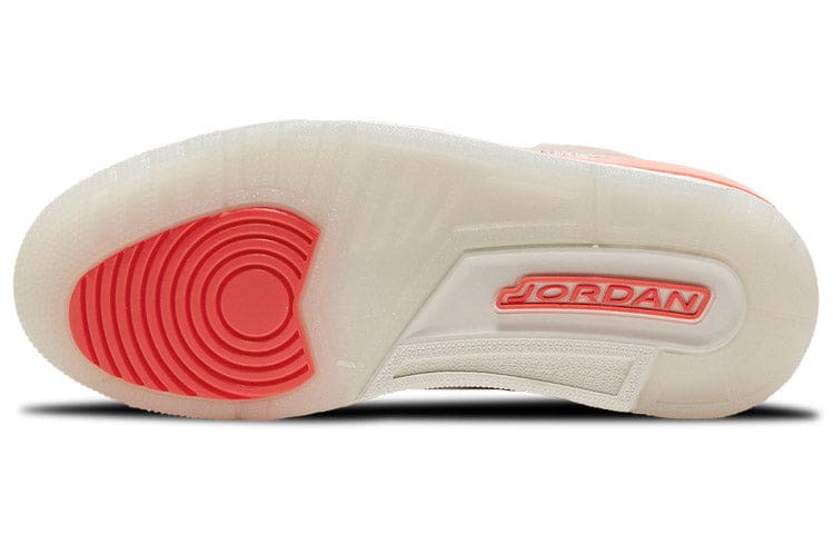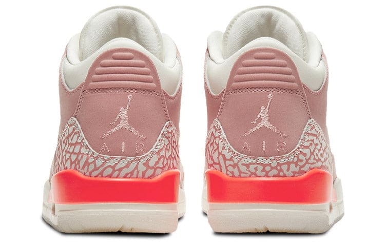 This Jordan 3 Rust Pink dresses the nubuck upper and built by white leather tongues, eye stays, and pop right at the collar. Moreover, it highlights the pair are Crimson accents throughout, an embroidered Jumpman logo on the heels made with a white midsole and milky-translucent outsole.