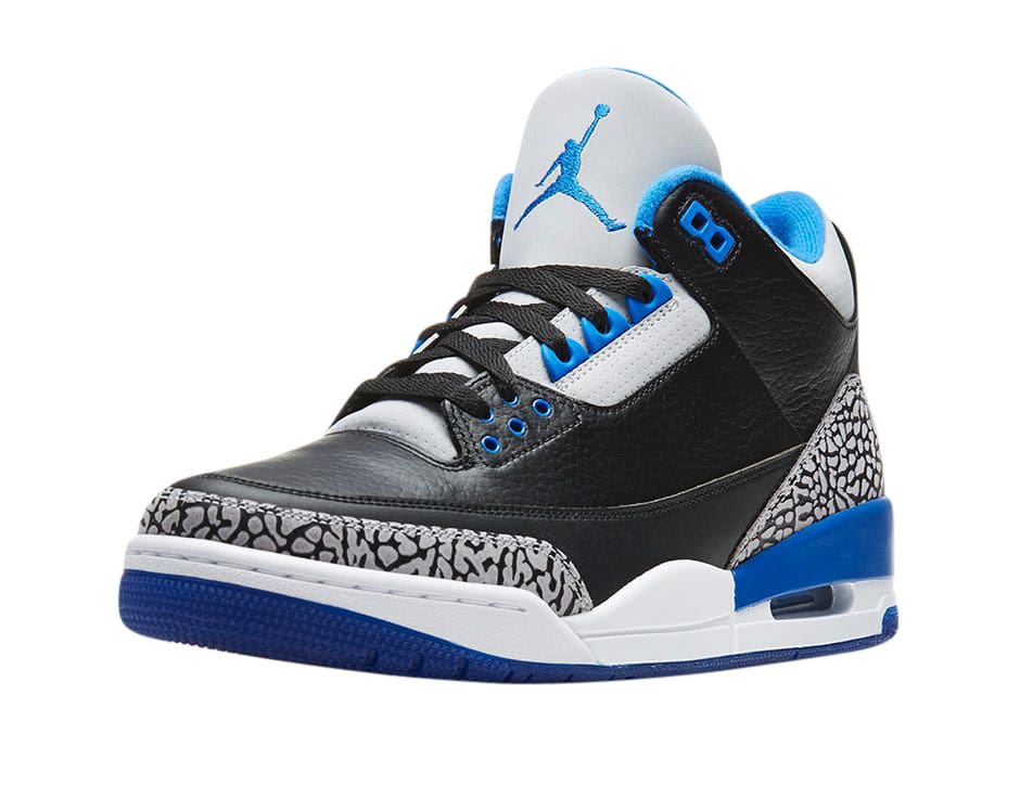 Reminiscent of the Air Jordan 3 “Black Cement”, the Air Jordan 3 “Sport Blue” sports a black leather upper with cement accents around the heel and toebox. Sport blue takes on the accents with grey mixed in as well.