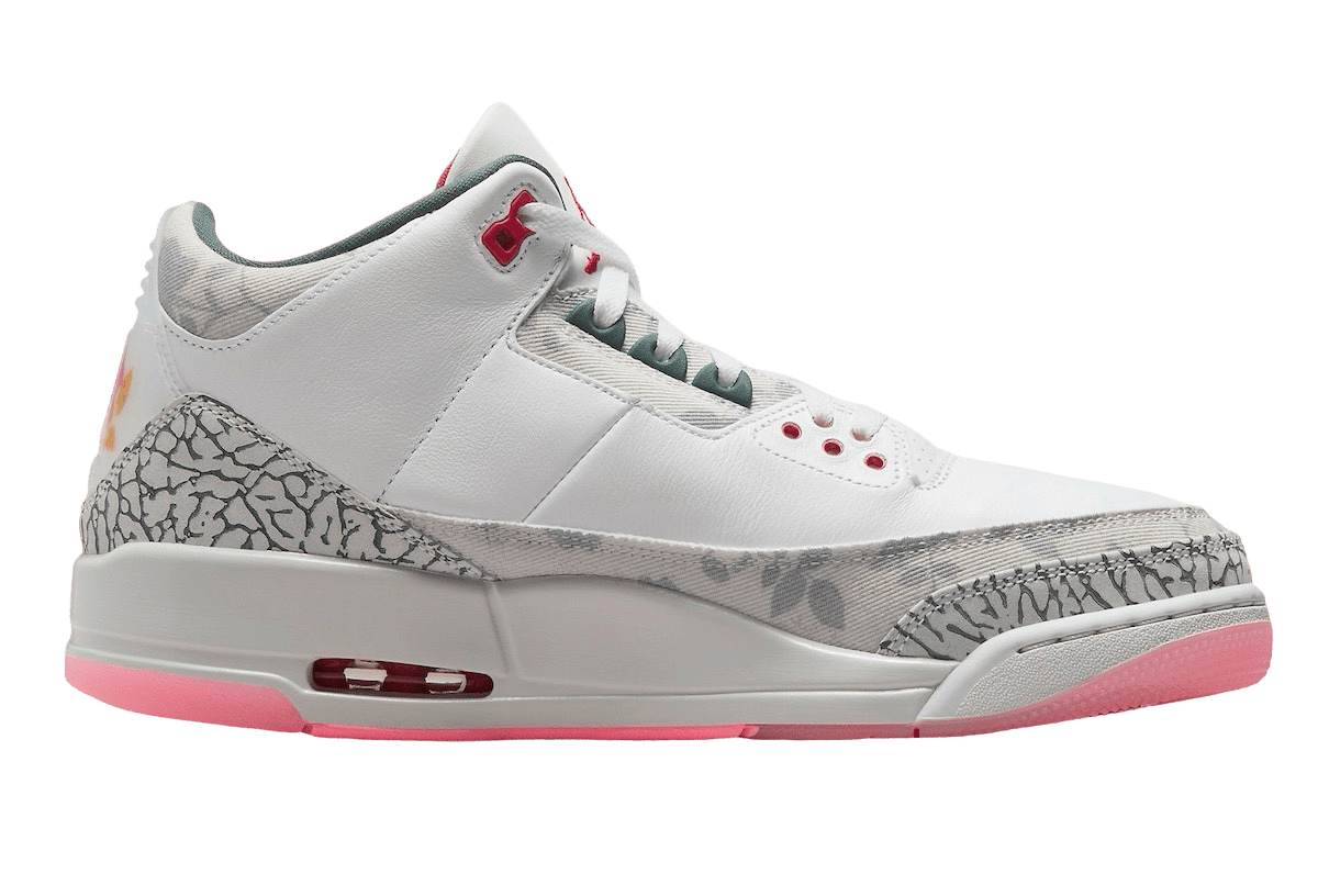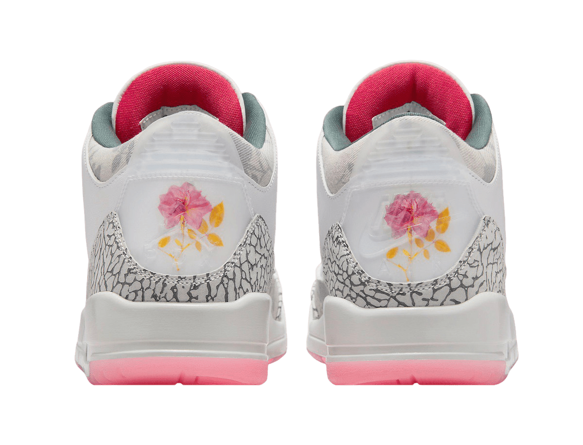 This release features an all-white leather upper with grey elephant print on the toe and heel overlay. It is complemented by a fire red Jumpman logo embroidered onto the tongues. Other notable details include a floral pattern on the mudguard, lace collar, and ankle. These areas showcase a patterned canvas adorned with faded images of rose stems. The mix of materials and intricate designs adds a unique look to the classic silhouette.
