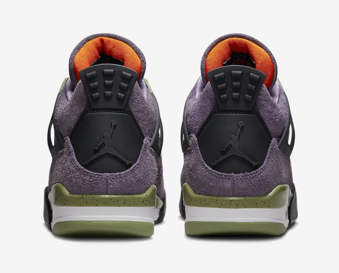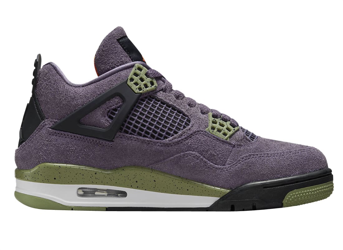 Dressed in a Canyon Purple, Anthracite, Alligator, and Safety Orange color scheme. This offering of theu00a0Air Jordan 4u00a0features a Purple suede base paired with Anthracite hits on the netting, tongue tags, wings, heel tabs, and laces. Green contrasting accents on the speckled eyelets and sole unit with pops of Orange throughout completes the design.
